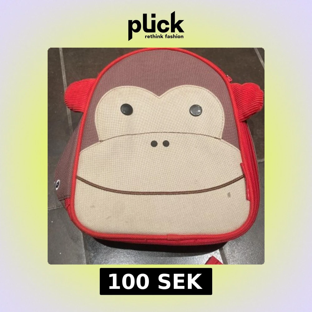 Söt ryggsäck från Skip Hop Zoo med apa på framsidan. Väskan är brun och beige med röda detaljer och öron, har justerbara axelband och dragkedja. Tillverkad i slitstark polyester och har ett rymligt huvudfack med innerficka.