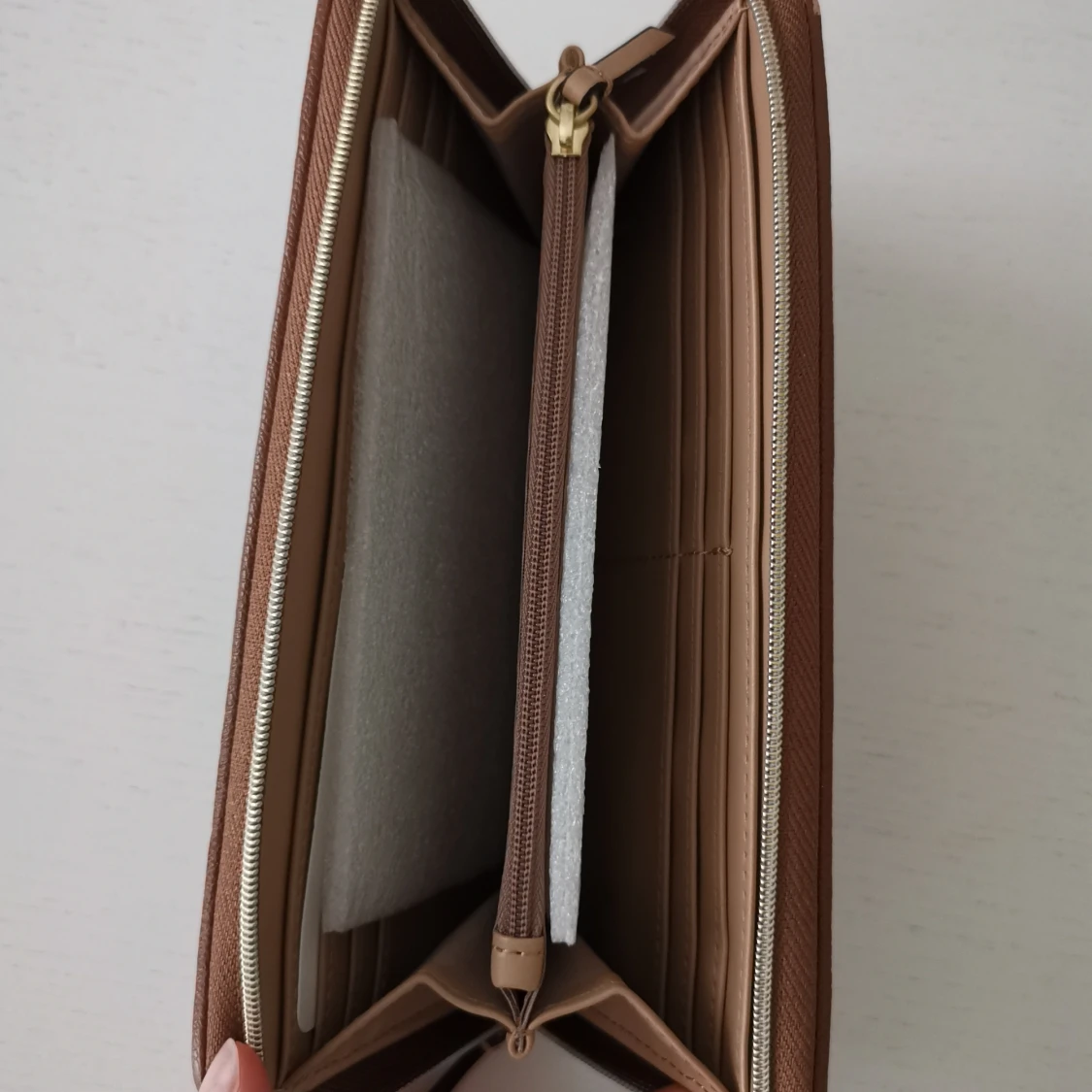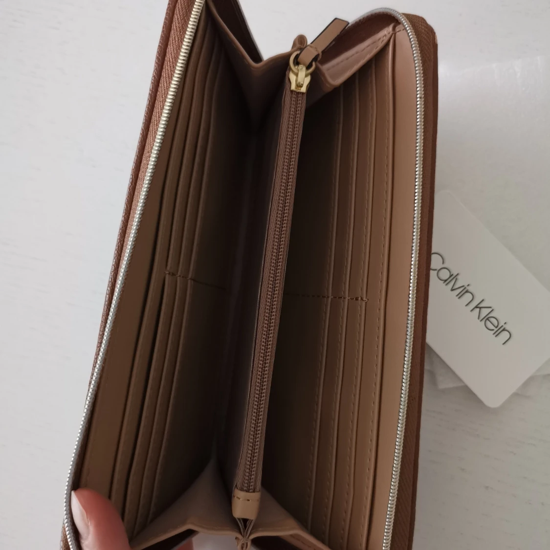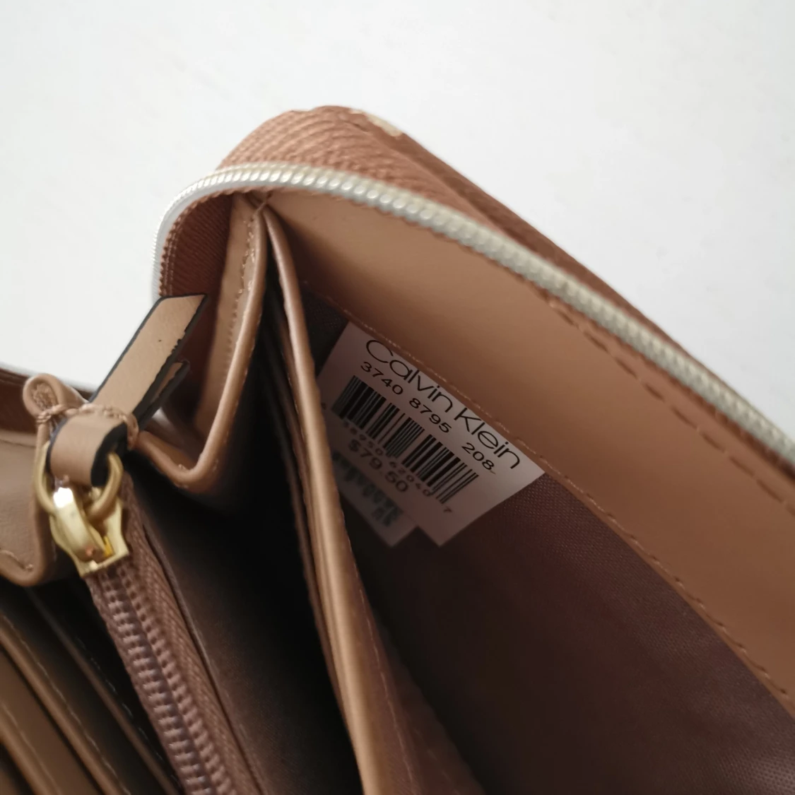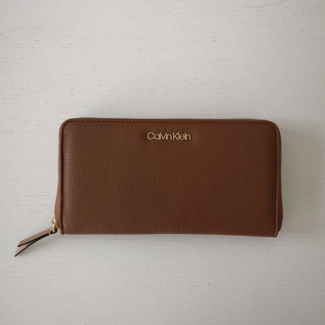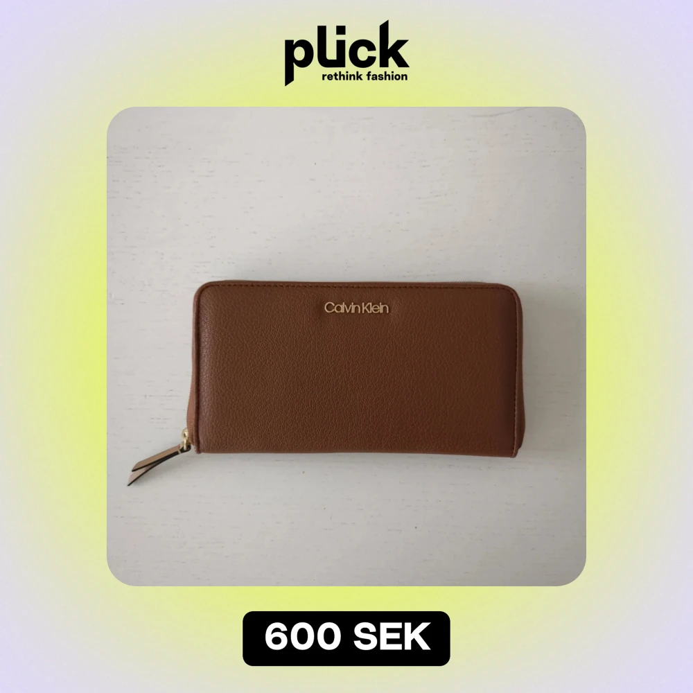 Säljer en snygg brun plånbok från Calvin Klein i mycket ny skick. Den är gjord av skinn och har en praktisk dragkedja runtom. Insidan har flera fack för kort och en mittficka med dragkedja för mynt. Perfekt för att hålla ordning på dina grejer med stil!