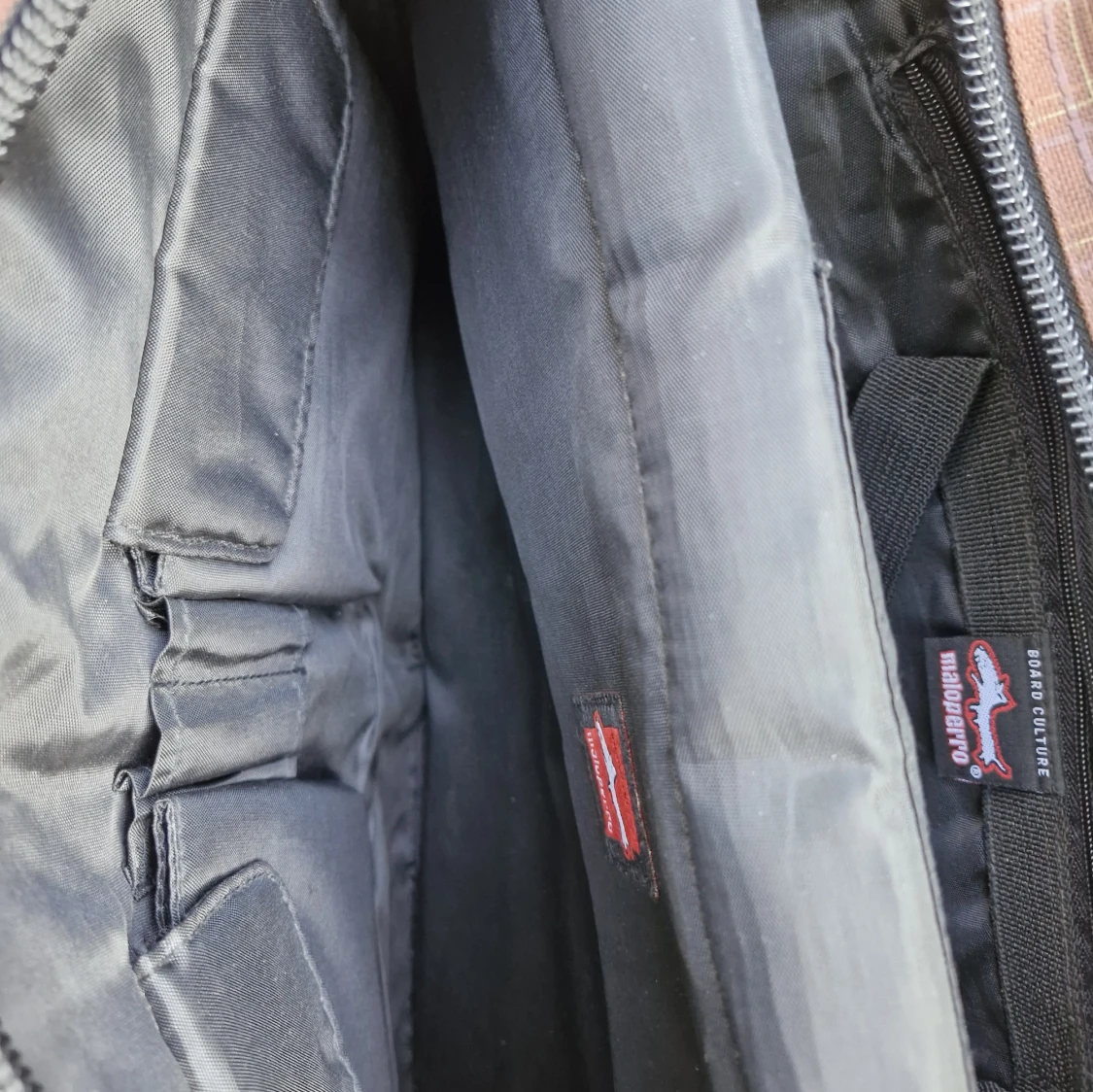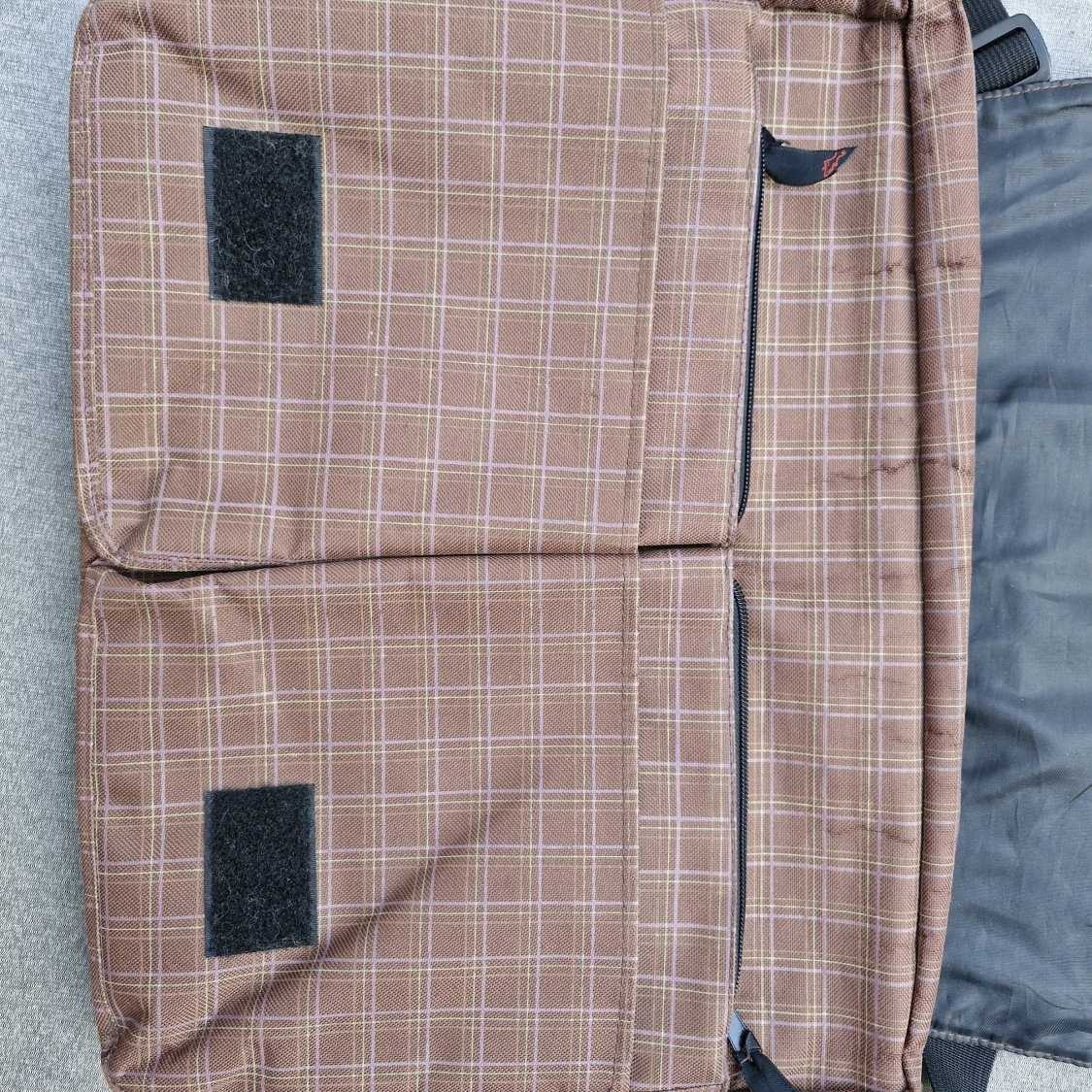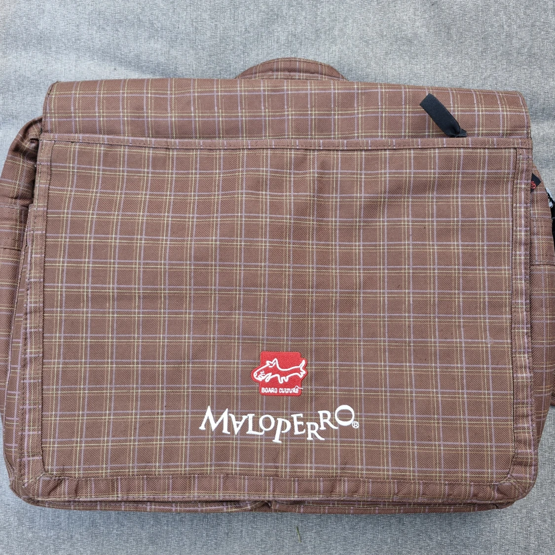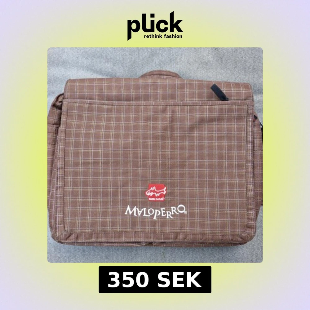 Säljer en brun datorväska från Maloperro med rutigt mönster och broderad logga framtill. Väskan har flera fack med dragkedja och praktiskt handtag upptill. Perfekt för att bära laptop och skolgrejer. Tillverkad i slitstark polyester. Måtten av datorväskan i cm ca: L 42, H 35, B 10