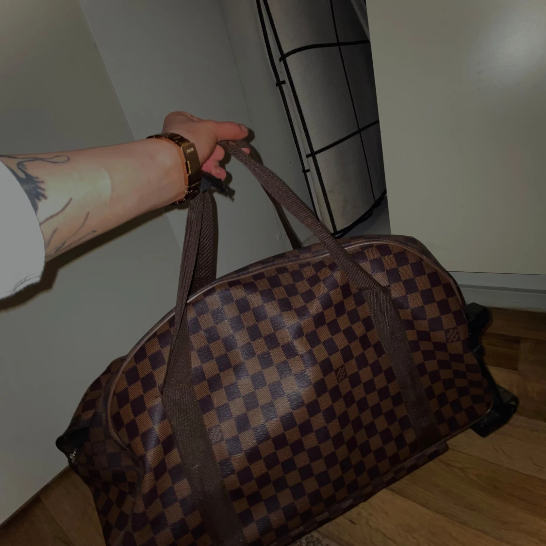 Snygg brun rutig resväska med dragkedja och teleskophandtag. Perfekt för resor med både handtag och hjul för enkel transport. Väskan har ett klassiskt rutmönster och är rymlig nog för alla dina behov.