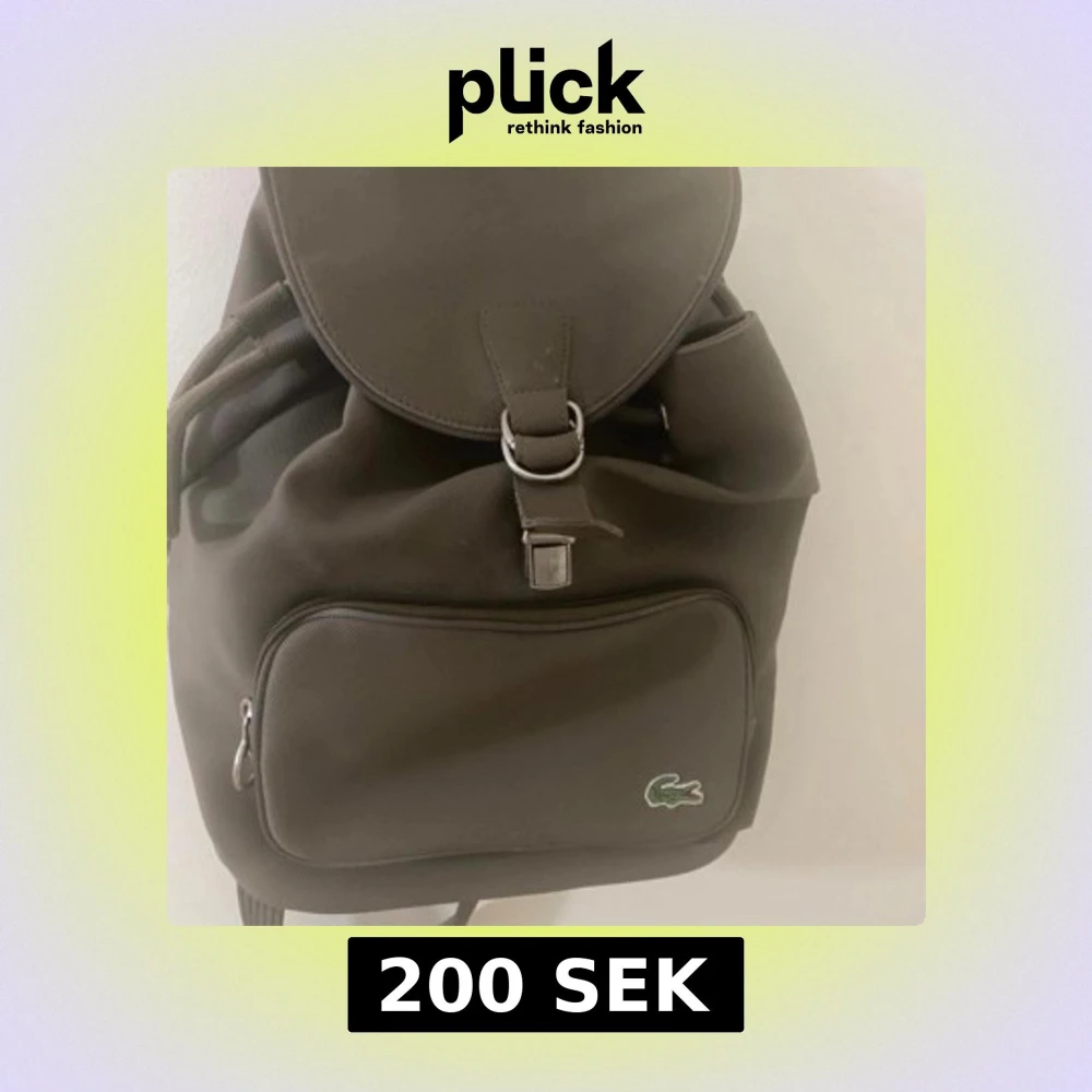 Snygg brun ryggsäck från Lacoste i slitstark polyester med klassisk krokodillogga framtill. Väskan har ett stort huvudfack med dragsko och lock, samt en praktisk ytterficka med dragkedja. Insidan är fodrad med grönt och beige randigt tyg.