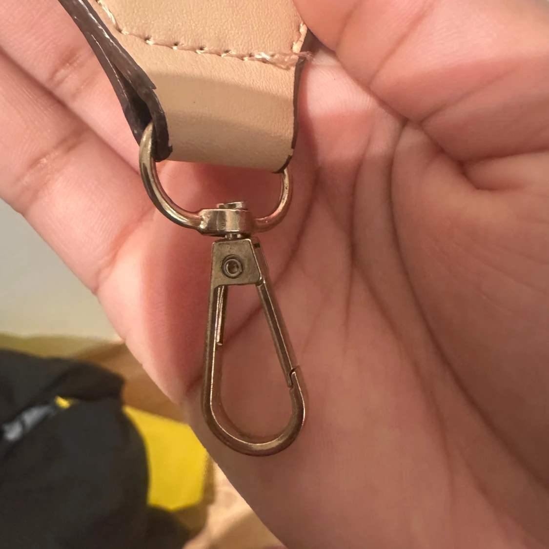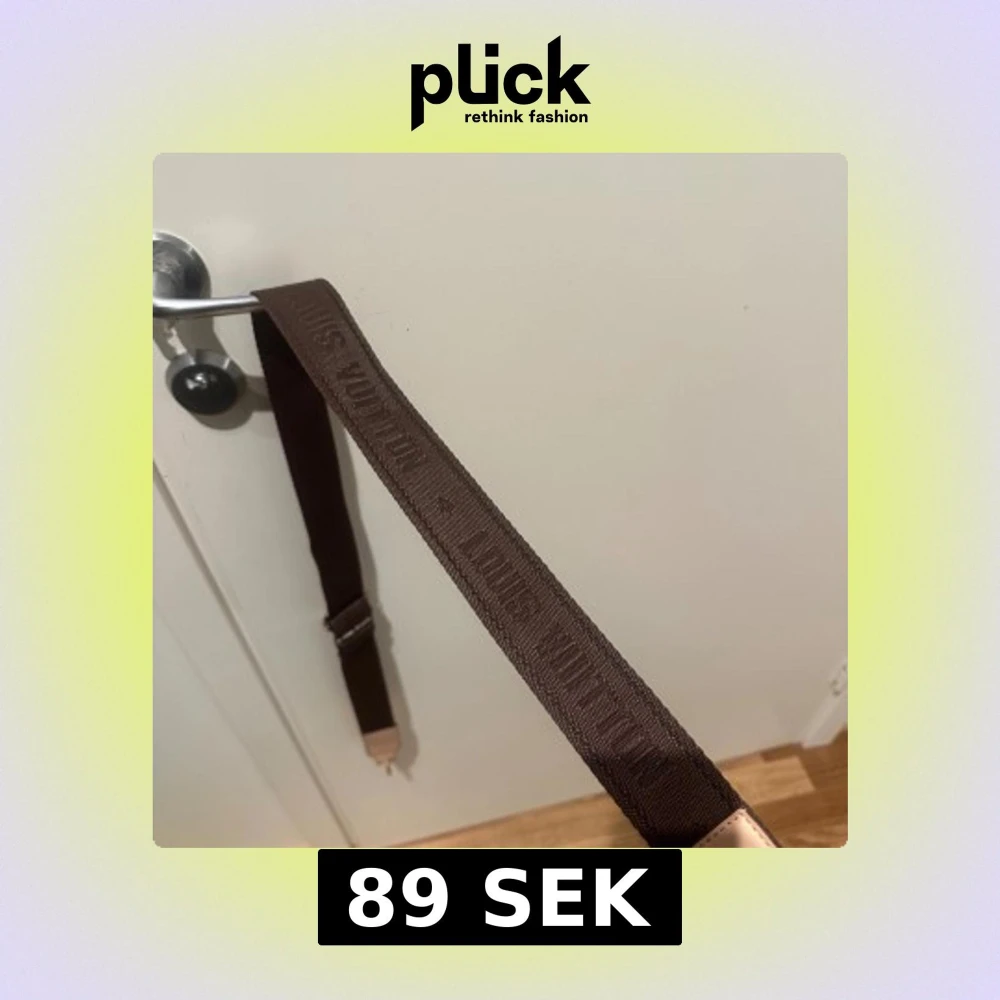 Snygg och bred axelrem i mörkbrunt textilmaterial med präglad logga och detaljer i beige skinn. Remmen har guldfärgade metallspännen och är perfekt för att ge din väska en lyxig touch.