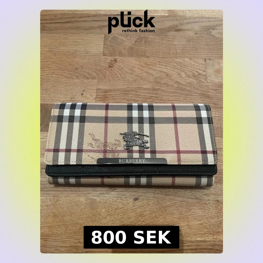 Säljer en klassisk plånbok från Burberry med det ikoniska rutiga mönstret i beige, svart, vitt och rött. Plånboken har flera kortfack, fönster för ID och detaljer i metall med Burberrys logga. Utsidan är i tåligt material och insidan är svart.