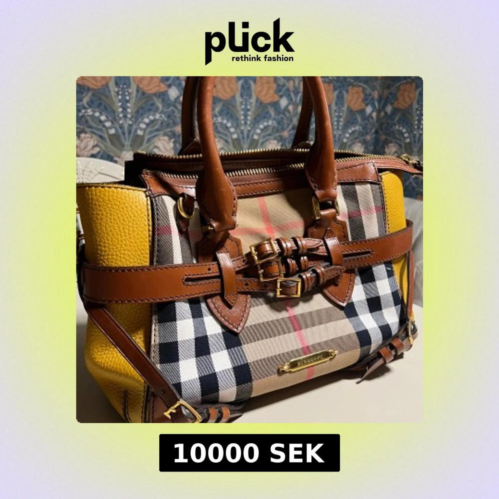 Snygg handväska från Burberry med klassiskt rutigt mönster, bruna läderdetaljer och spännen i guld. Sidorna är i gul skinn och väskan har både handtag och axelrem. Invändigt finns svart foder och innerficka med dragkedja. Perfekt för dig som vill sticka ut med en ikonisk design.