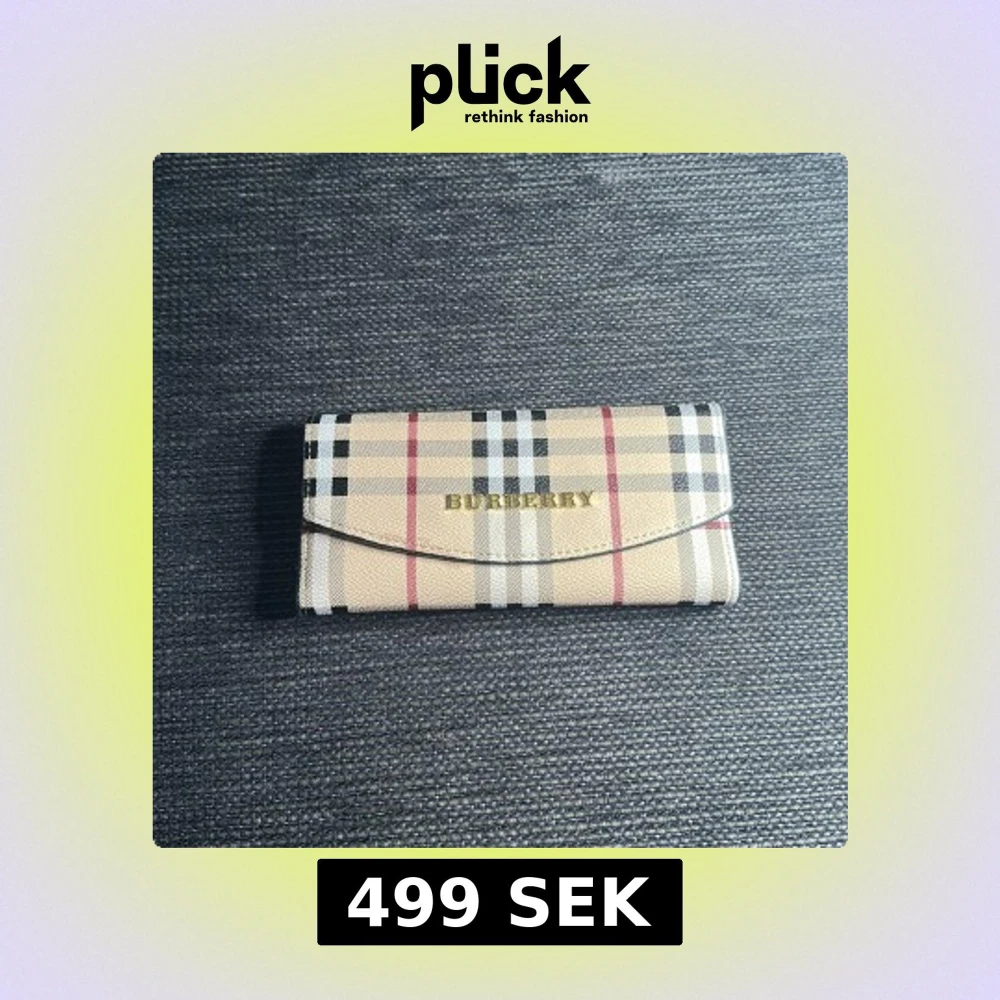 Snygg plånbok från Burberry i klassiskt beige, svart, vit och rött rutigt mönster. Plånboken har guldfärgad logga, tryckknapp och flera fack för kort och ID. Utsidan är i tåligt material och insidan är svart med stilren design.