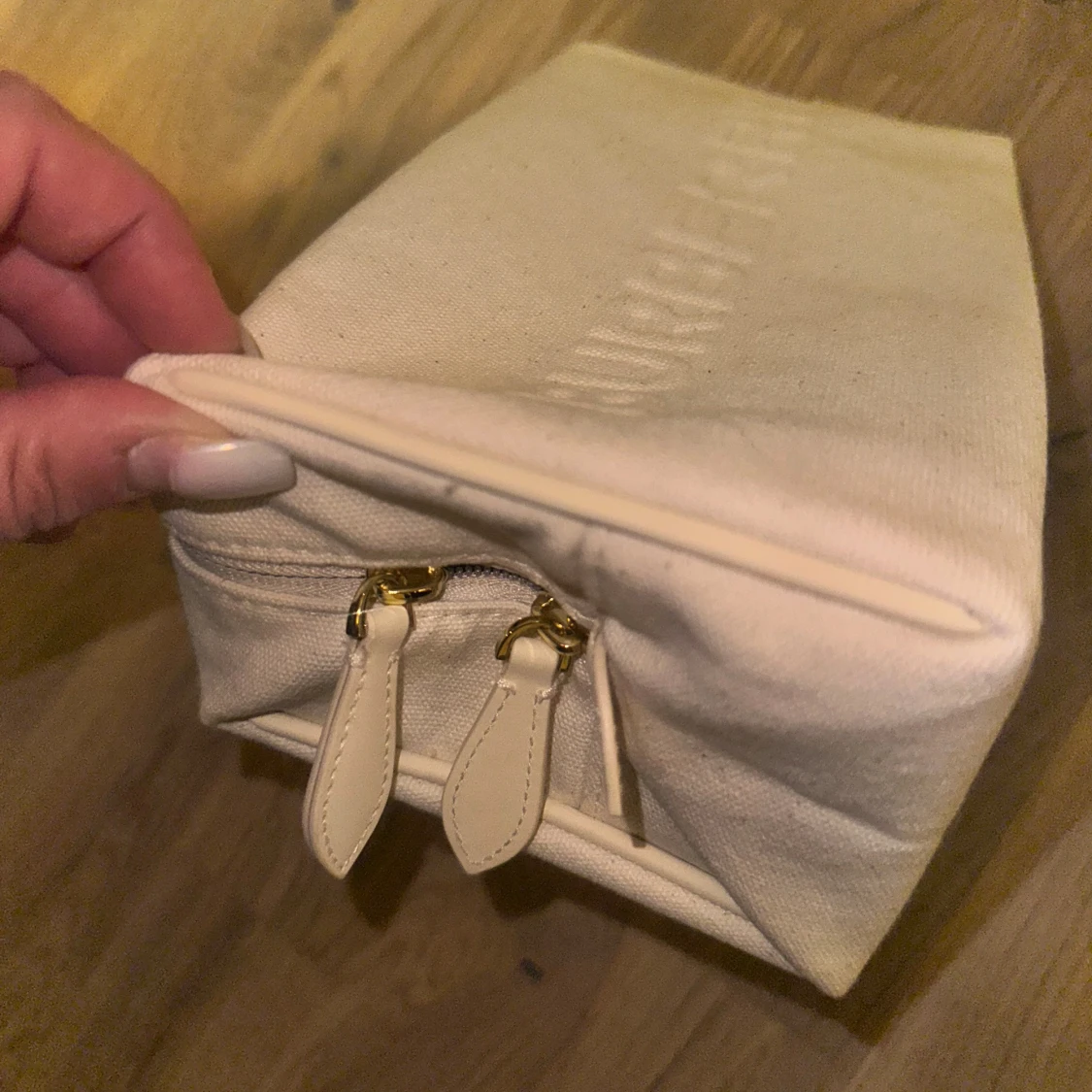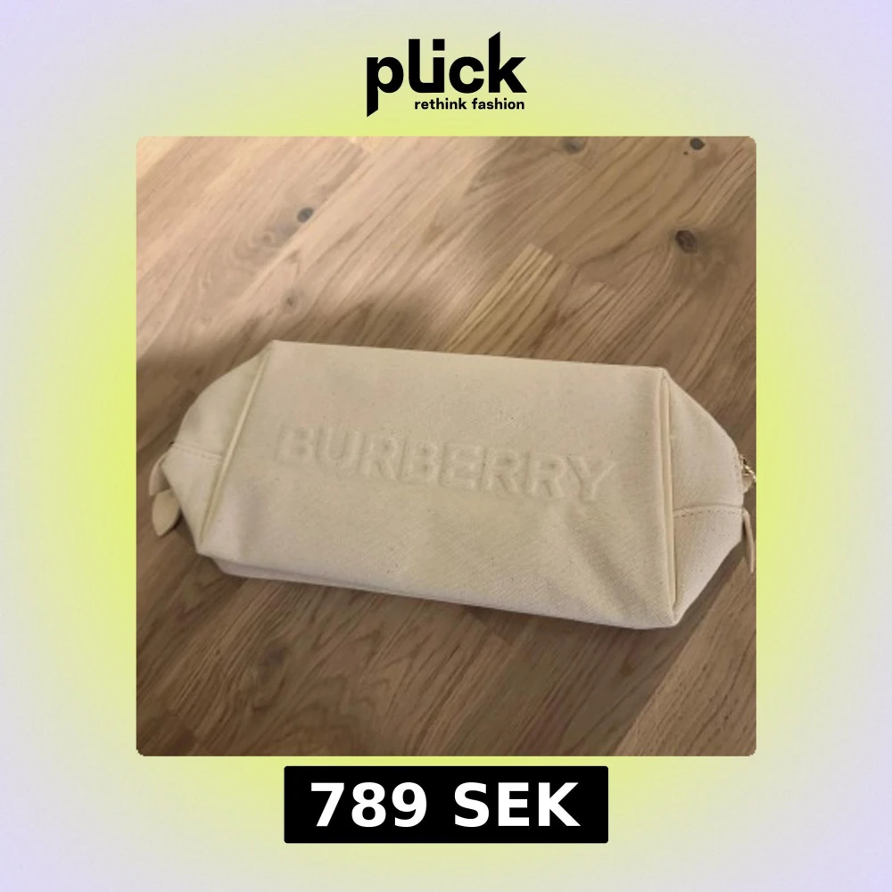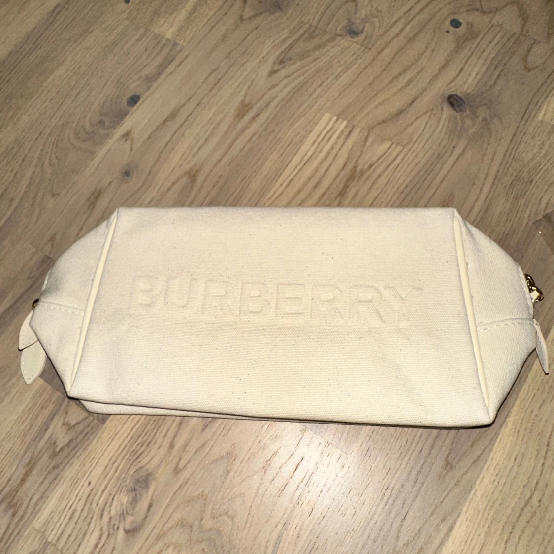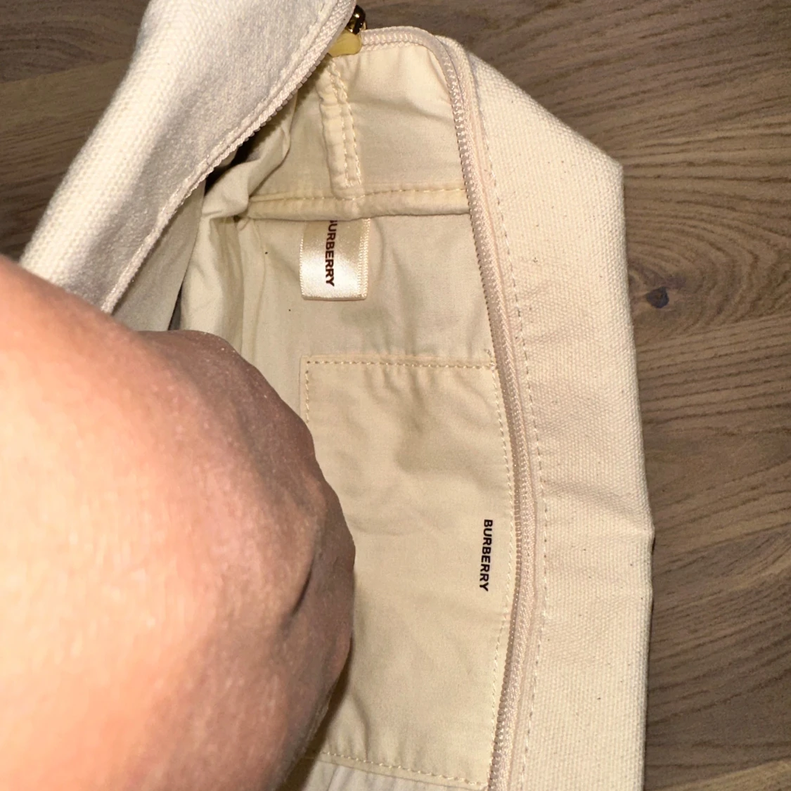Snygg beige kuvertväska från Burberry i bomull med präglad logga på framsidan. Väskan har två dragkedjor med guldfärgade detaljer och praktisk innerficka. Perfekt för att hålla koll på dina essentials och ge din look en clean vibe.