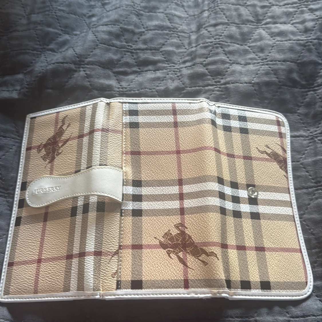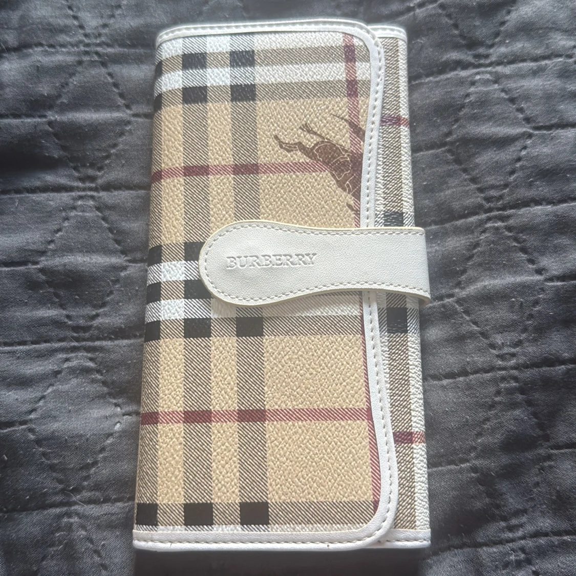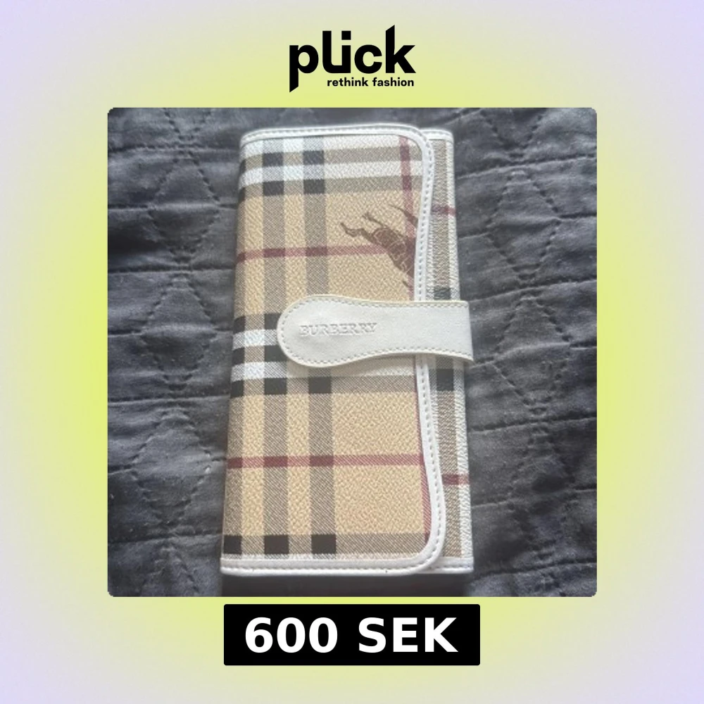 Snygg plånbok från Burberry i klassiskt beige, svart och rött rutmönster. Plånboken har vita detaljer och flera fack för kort och sedlar. Tillverkad i skinn och polyester, med Burberry-logga på framsidan och insidan.
