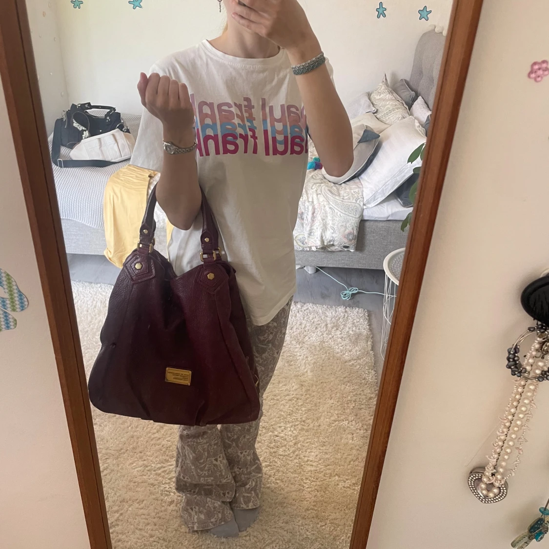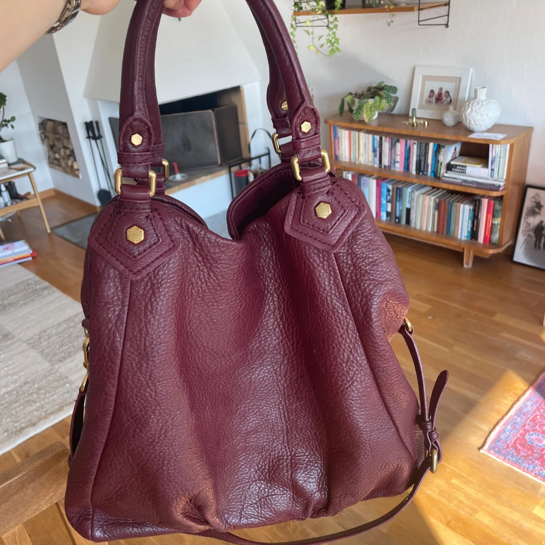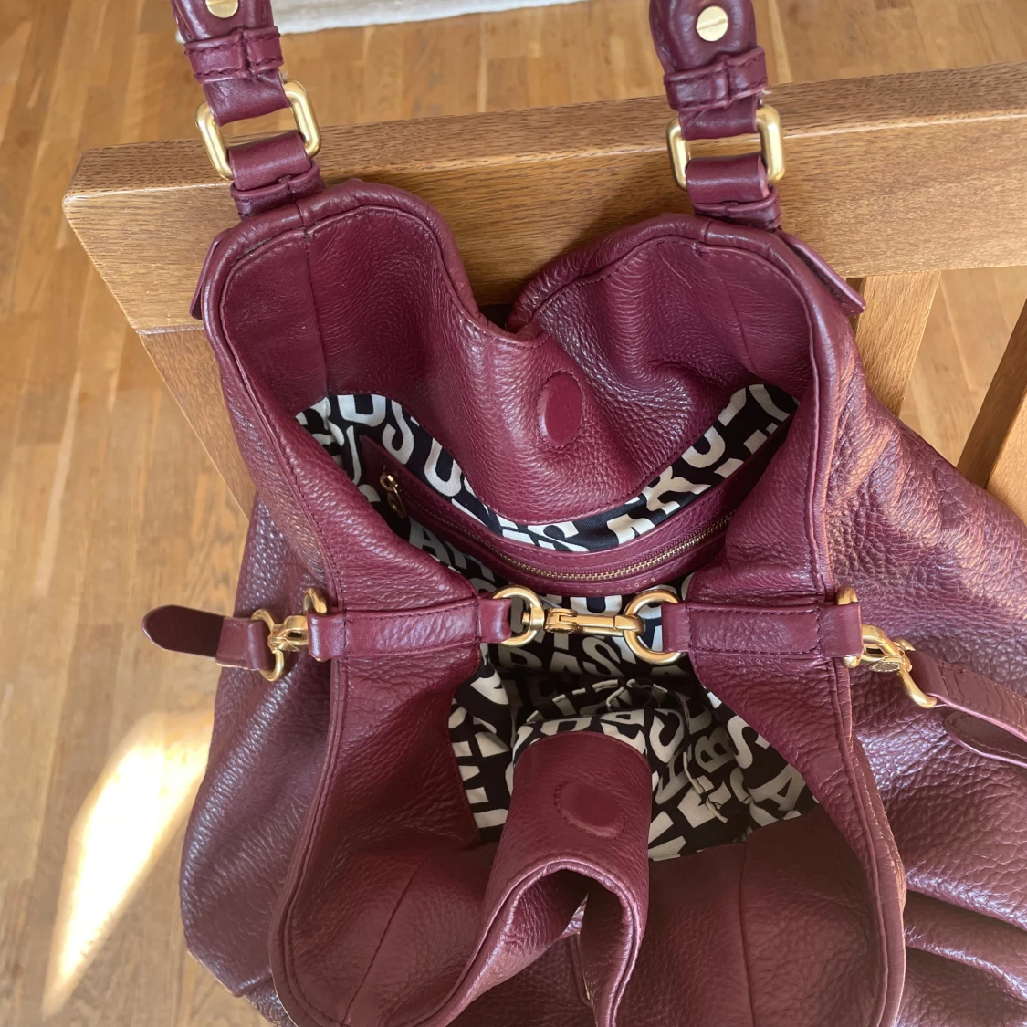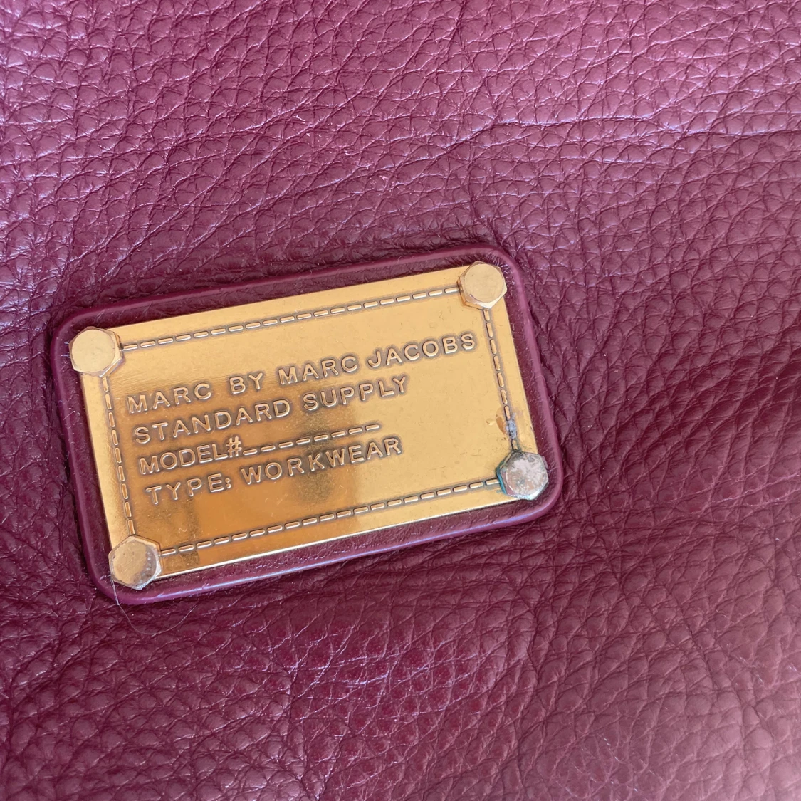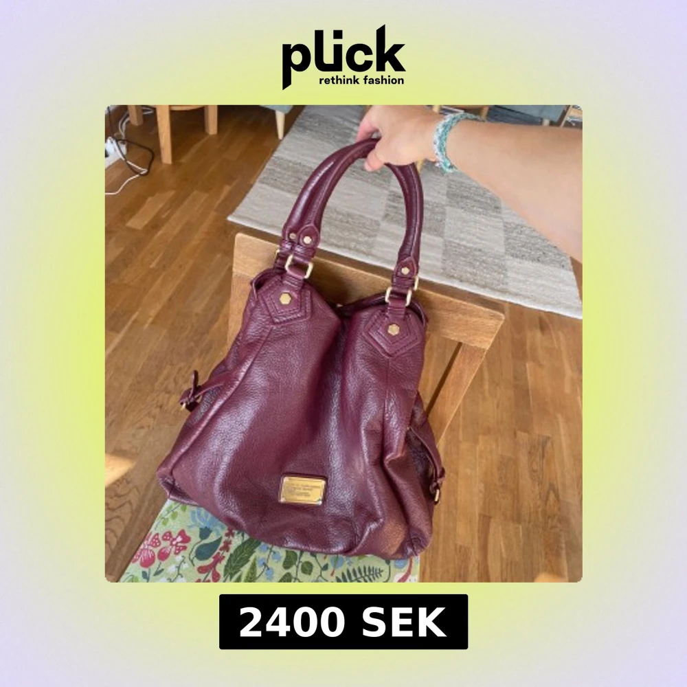 Supersnygg vinröd handväska från Marc by Marc Jacobs i äkta skinn med guldfärgade metalldetaljer och dubbla handtag. Den har en cool innerfodring med texten ”Marc Jacobs” Perfekt storlek för skola/jobb då den rymmer laptop och mappar! I helt perfekt skick, skriv vid frågor😊