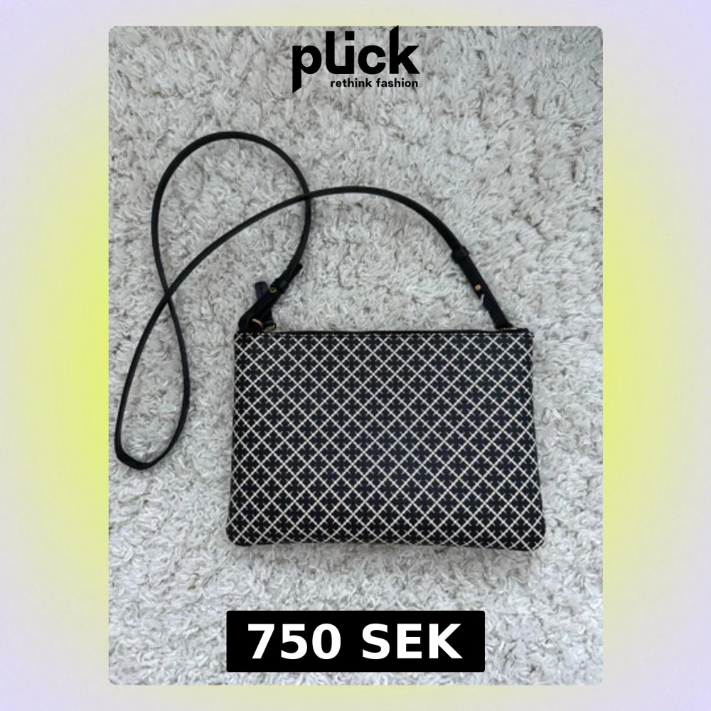 Snygg axelväska från By Malene Birger med svart och vit rutigt mönster. Väskan har en smal axelrem i svart och guldfärgad dragkedja. Insidan är fodrad i en brunrosa ton. Perfekt storlek för det viktigaste och stilren design. Bredd 25,5cm och höjd 18cm
