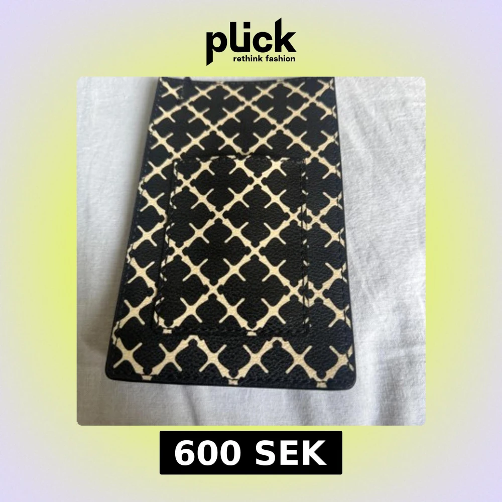 Säljer en snygg korthållare från By Malene Birger i svart och beige med grafiskt mönster. Perfekt att lägga in mobilen och kort. Klassisk och stilren design med By Malene Birger-logga i guld. Man kan även lägga kort framför. Den är helt oanvänd