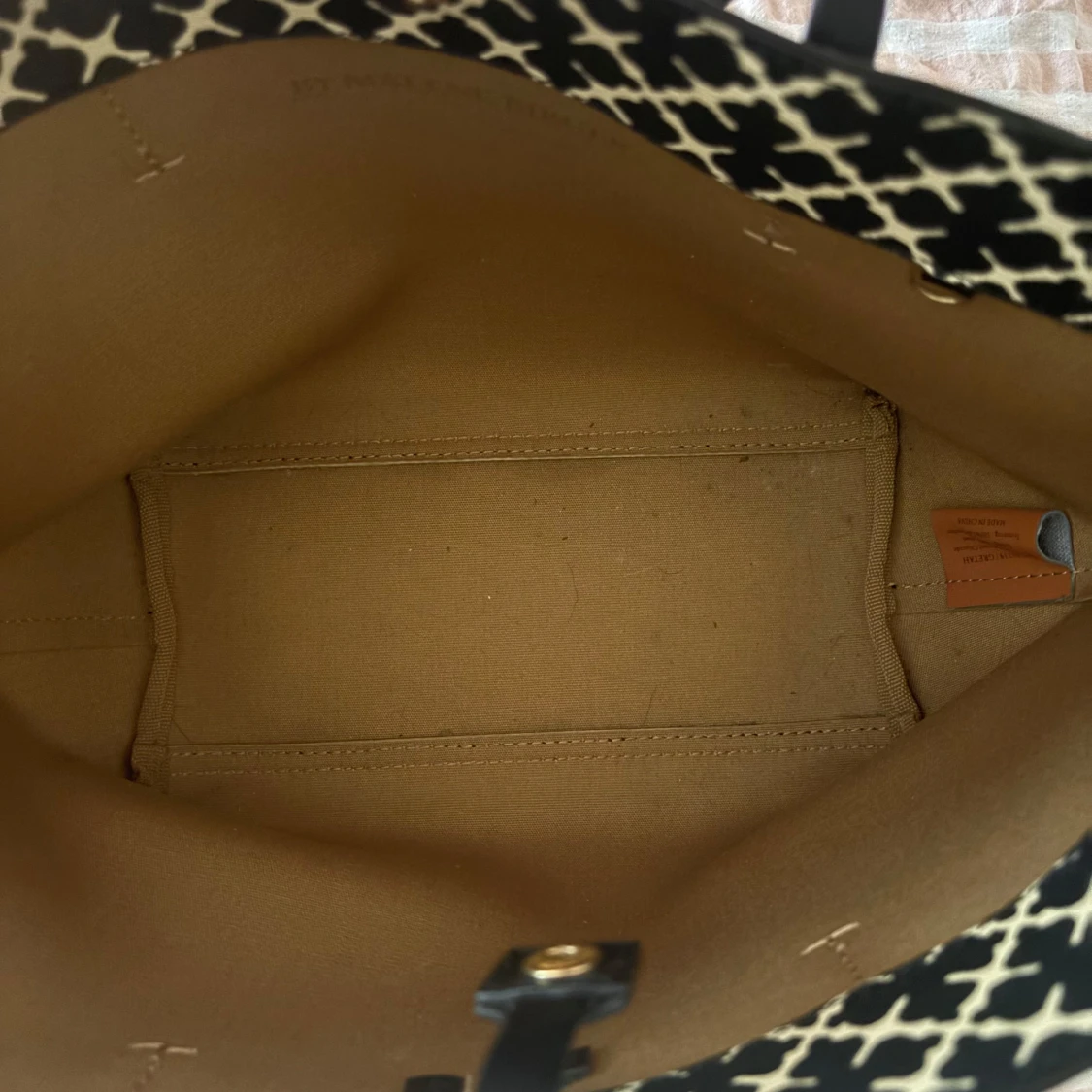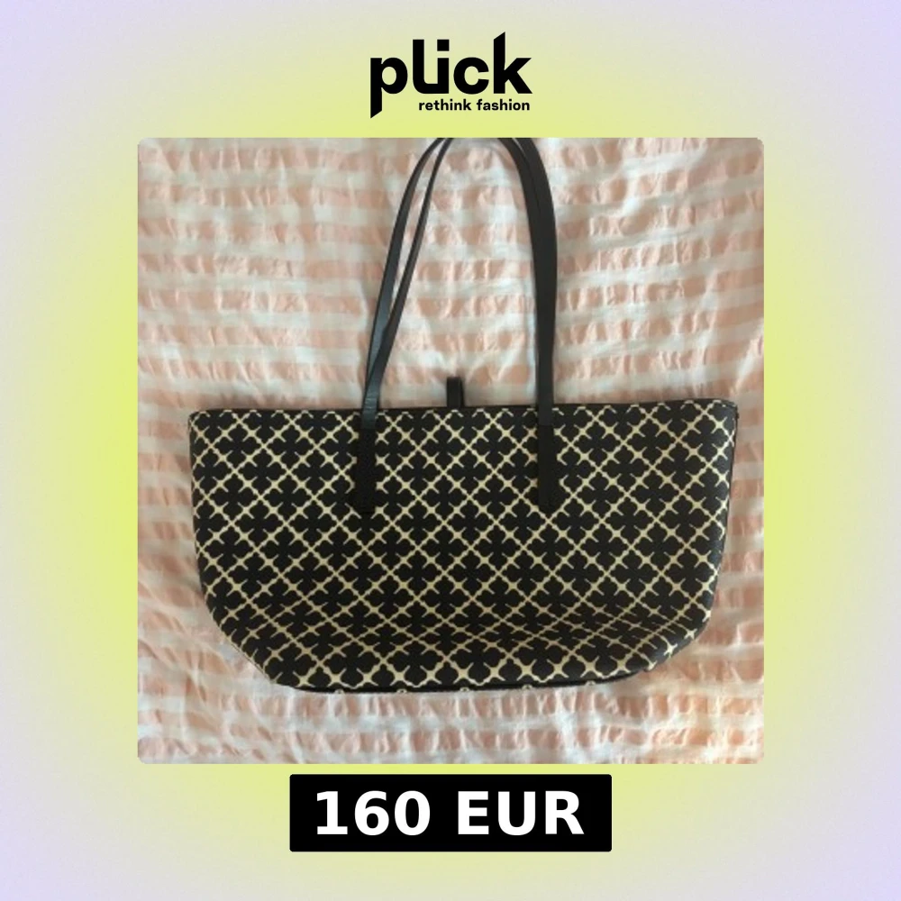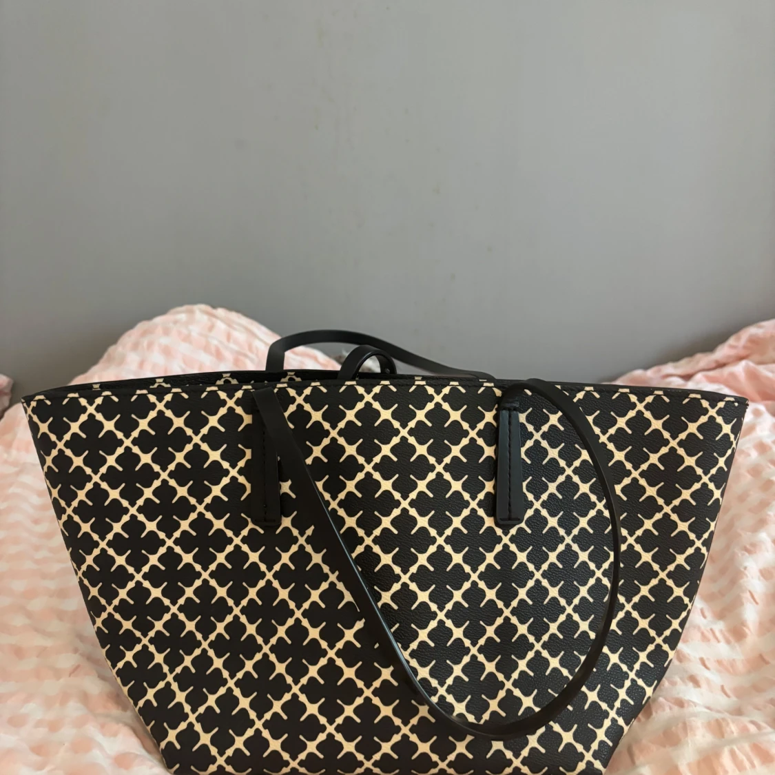 Stilren shoppingväska från By Malene Birger i svart och vitt med klassiskt grafiskt mönster. Väskan har långa svarta handtag, rymligt beige innerfoder och stängs med ett smidigt spänne. Perfekt för dig som vill ha plats för allt du behöver under dagen.