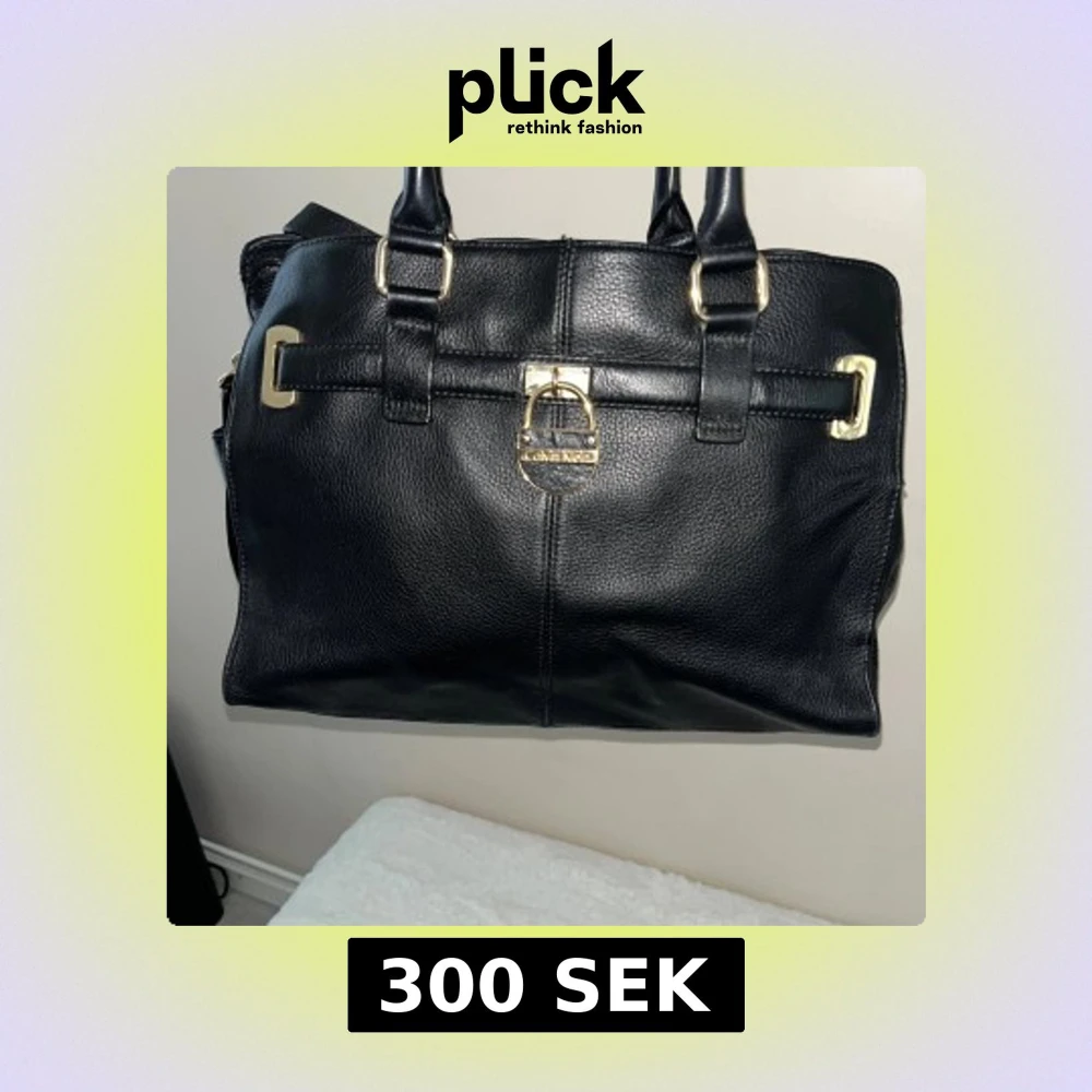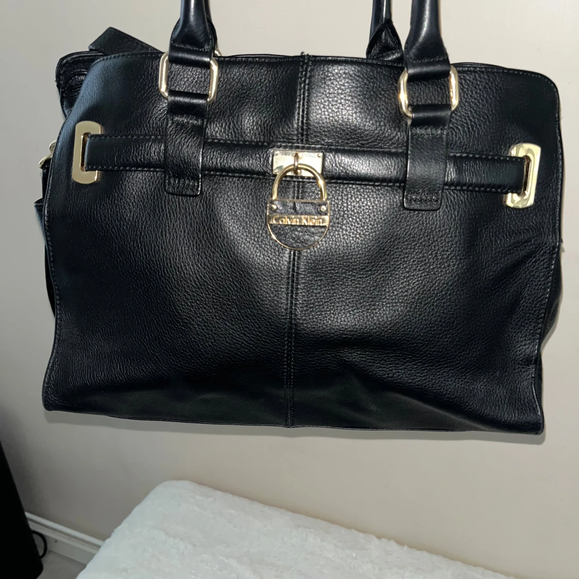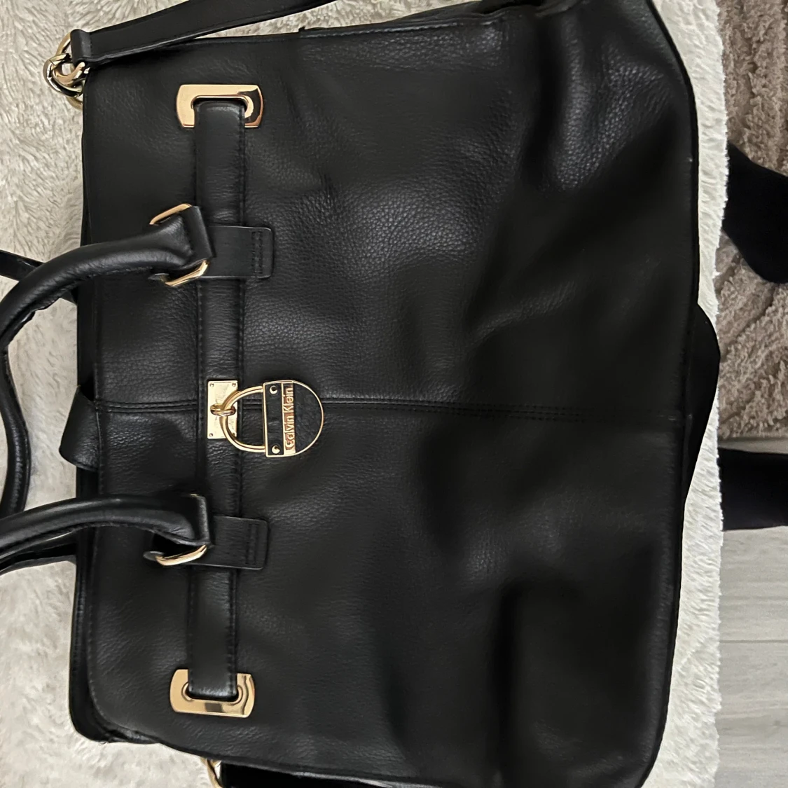 Stilren svart handväska från Calvin Klein i äkta skinn med guldfärgade metalldetaljer. Väskan har dubbla handtag och ett dekorativt spänne med logotyp framtill. Perfekt storlek för att få plats med allt du behöver och passar till många olika looks.