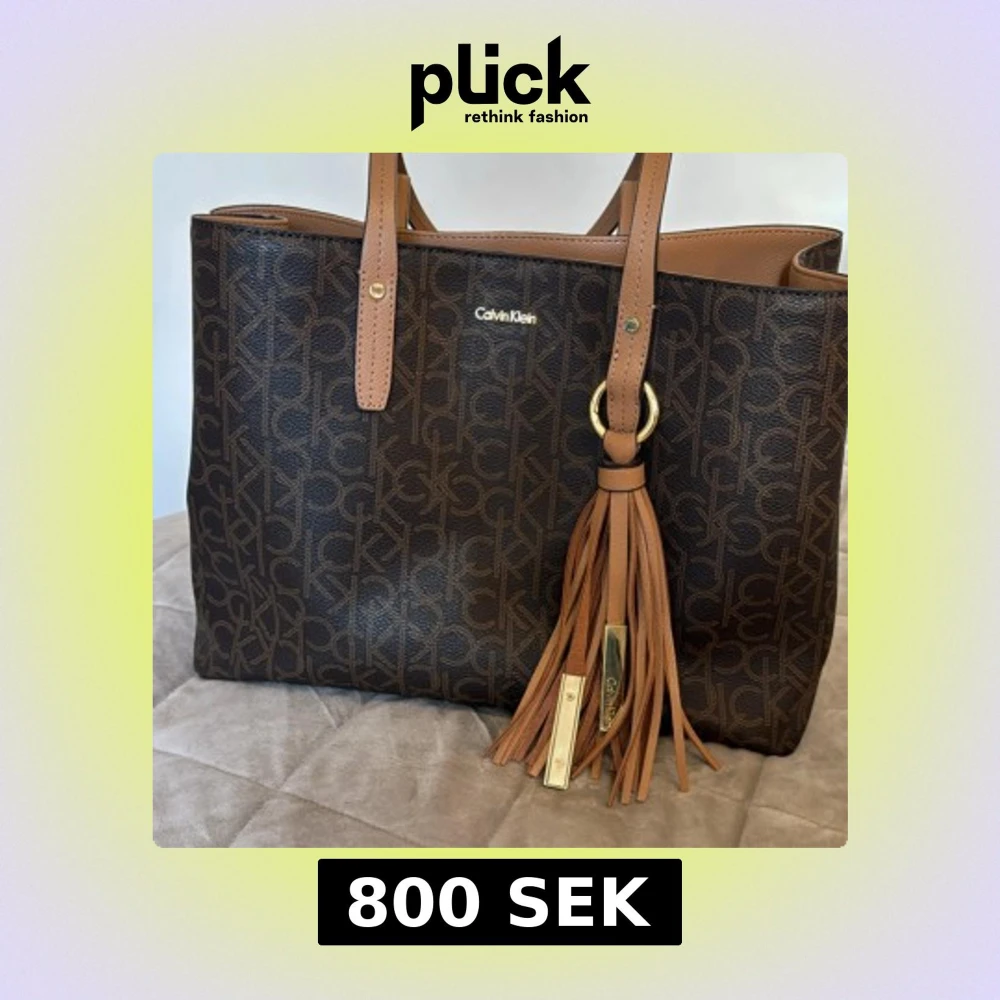 Snygg brun handväska från Calvin Klein. Väskan har tofsdekor i skinn, guldfärgade metalldetaljer och rymligt fack med dragkedja. Perfekt för dig som letar efter en väska för skolan!
