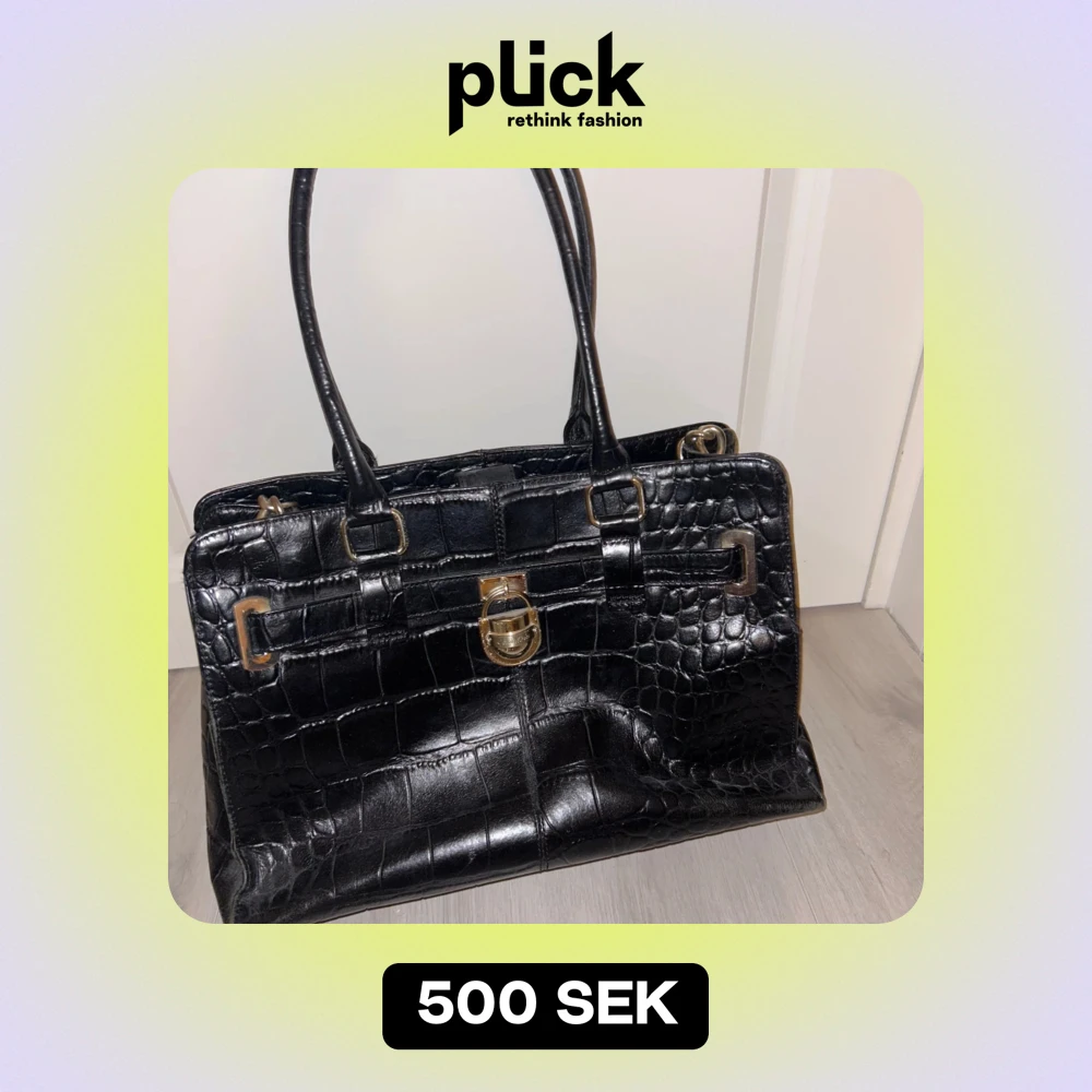 Snygg svart handväska från Calvin klein i skinn med krokodilmönster och gulddetaljer. Väskan har ett elegant lås framtill och flera fack inuti för bra organisering. Perfekt för både vardag och fest👩❤️💋👩