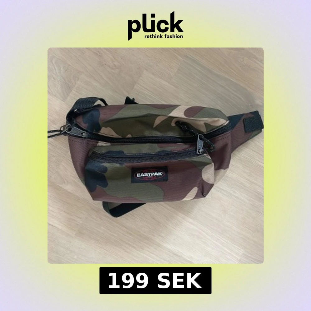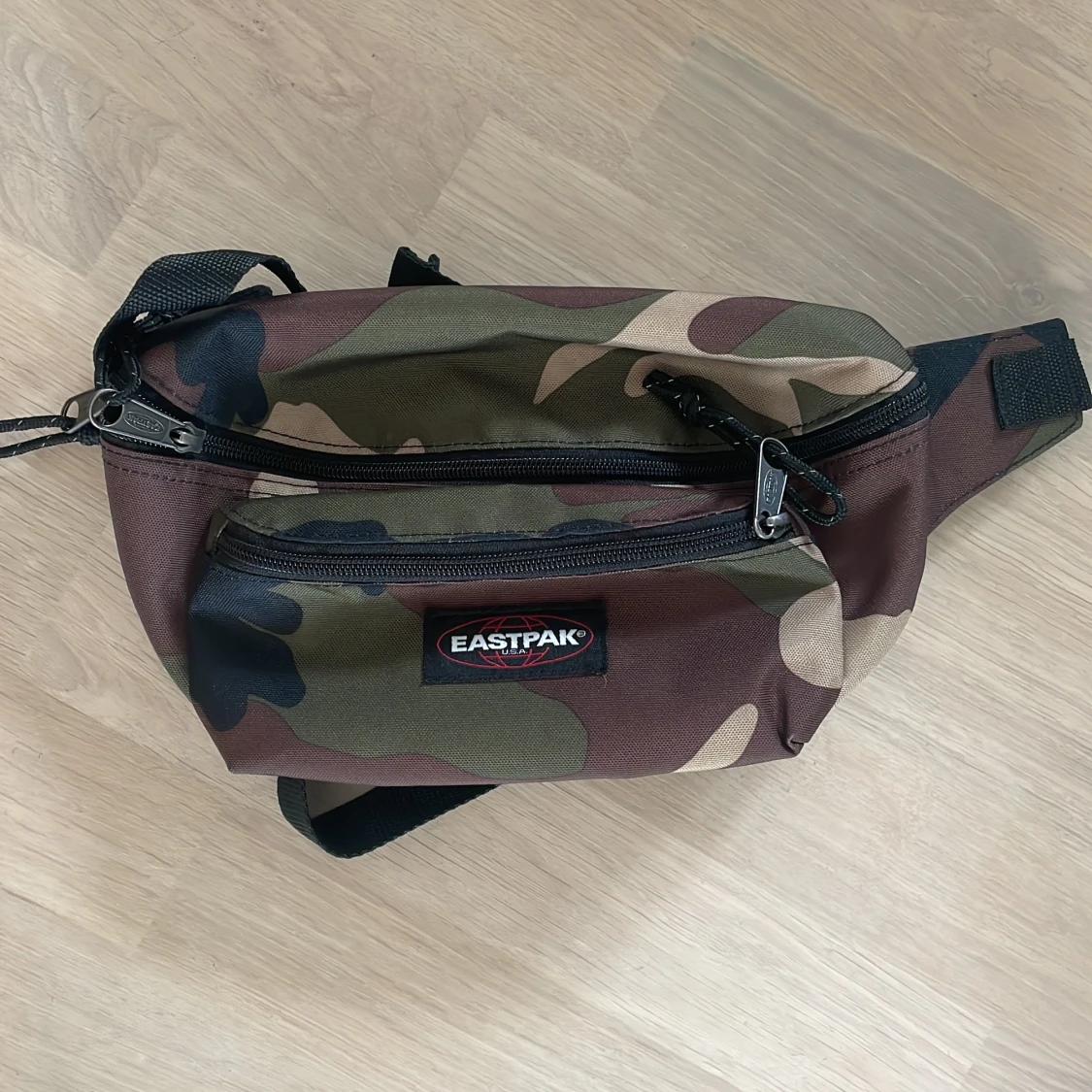 Säljer en snygg magväska från Eastpak i klassiskt camouflage-mönster. Väskan har två dragkedjefack och justerbart band, perfekt för att bära det viktigaste. Materialet är slitstark polyester och färgerna går i grönt, brunt och beige.
