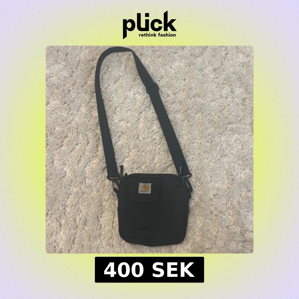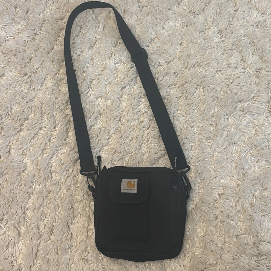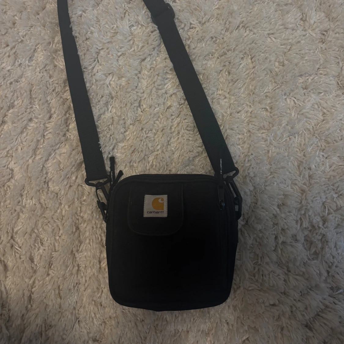 Säljer en stilren svart axelväska från Carhartt. Väskan har en justerbar axelrem och en praktisk ficka med dragkedja framtill. Perfekt för att bära med sig det nödvändigaste på ett smidigt sätt.