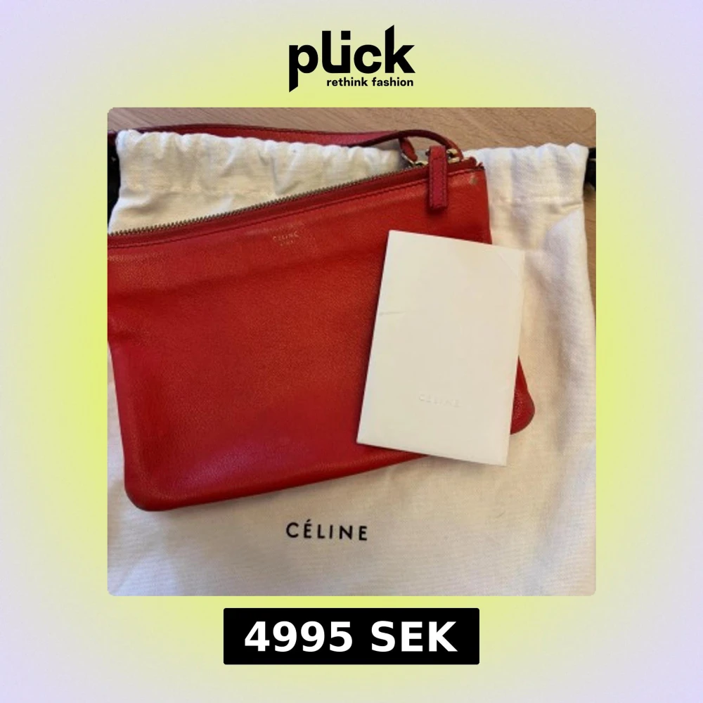 CÉLINE Small Trio Crossbody Bag i rött skinn med guldfärgade beslag. 22x15x4 cm.