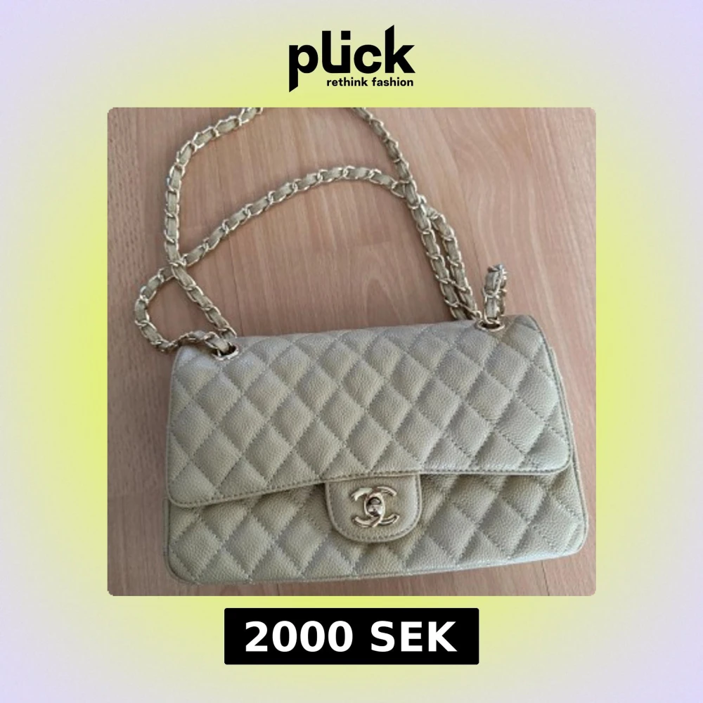 Säljer en beige axelväska med klassiskt quiltat mönster och guldfärgad kedja. Väskan har en ikonisk CC-detalj på locket och är tillverkad i skinn med en lyxig känsla. Perfekt storlek för det viktigaste och snygg att bära crossbody.