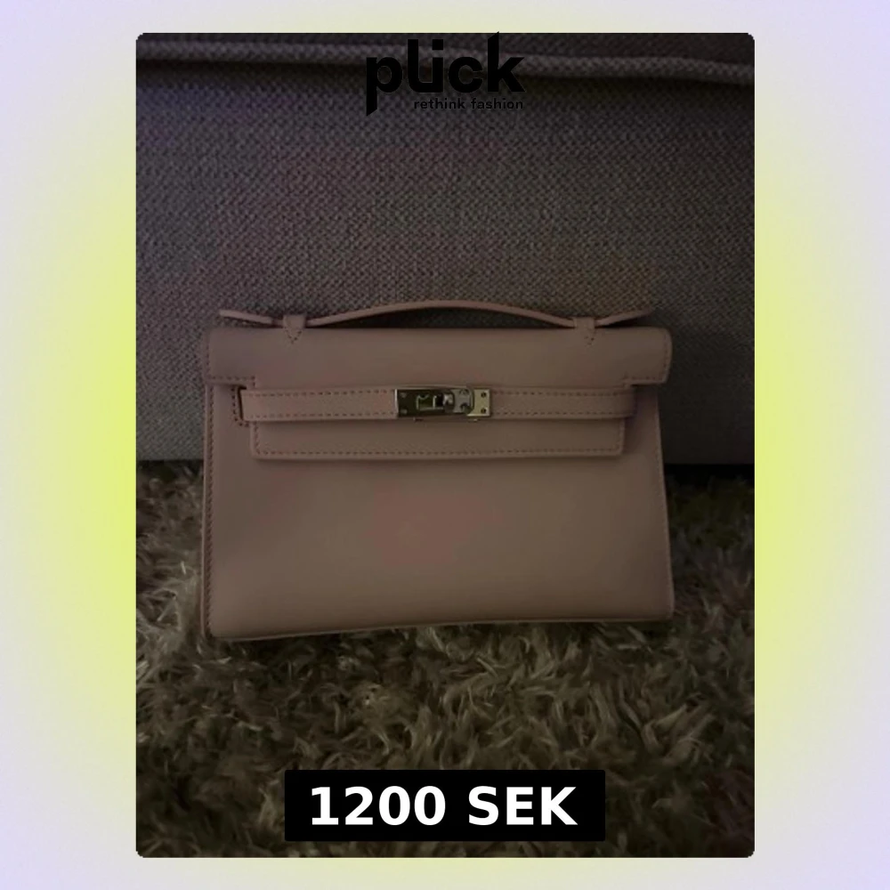 Säljer en stilren ljusrosa handväska i skinn med klassisk rektangulär form och elegant handtag. Väskan har snygga silverfärgade metalldetaljer och ett vridlås framtill. Perfekt för dig som gillar minimalistisk design och vill ha en chic accessoar.