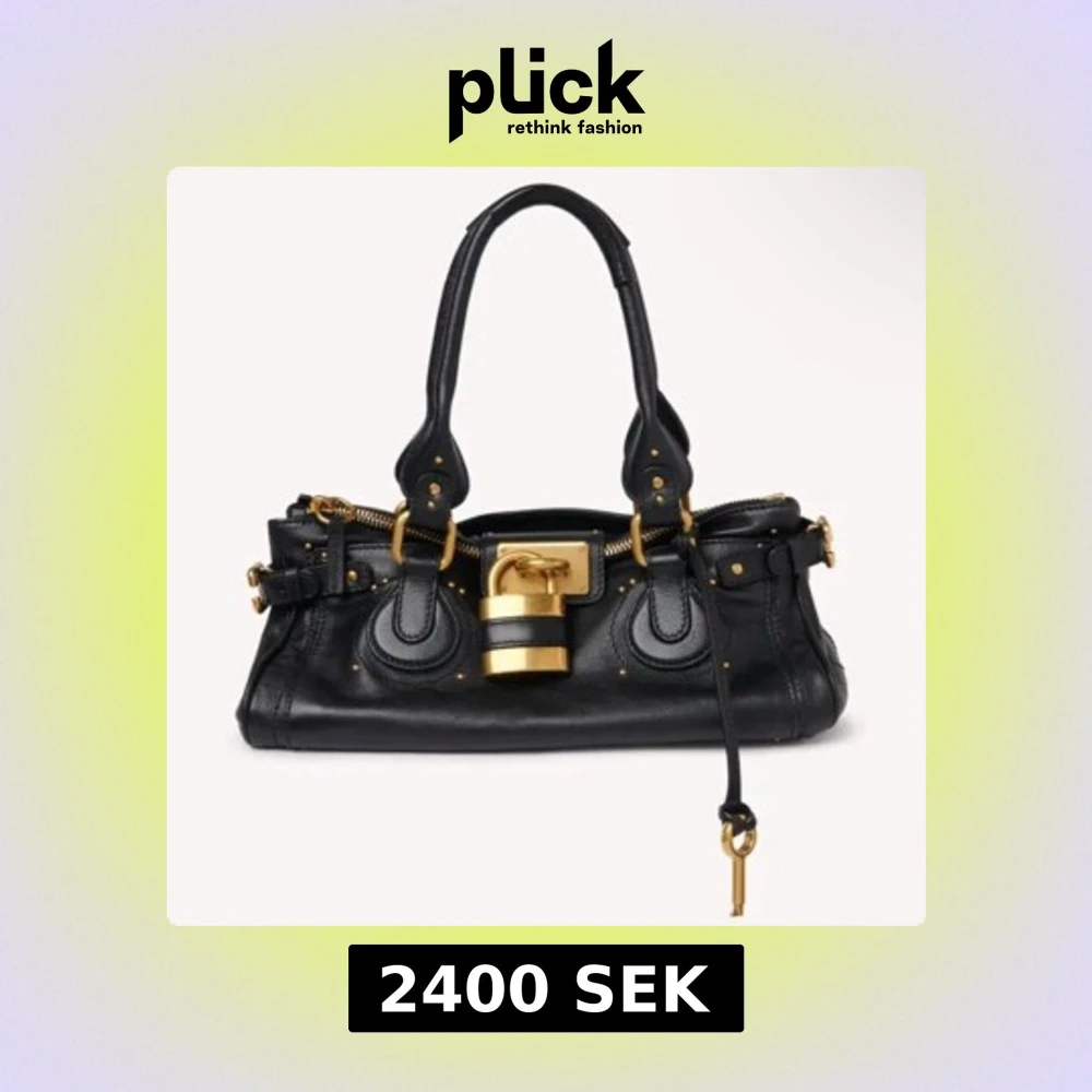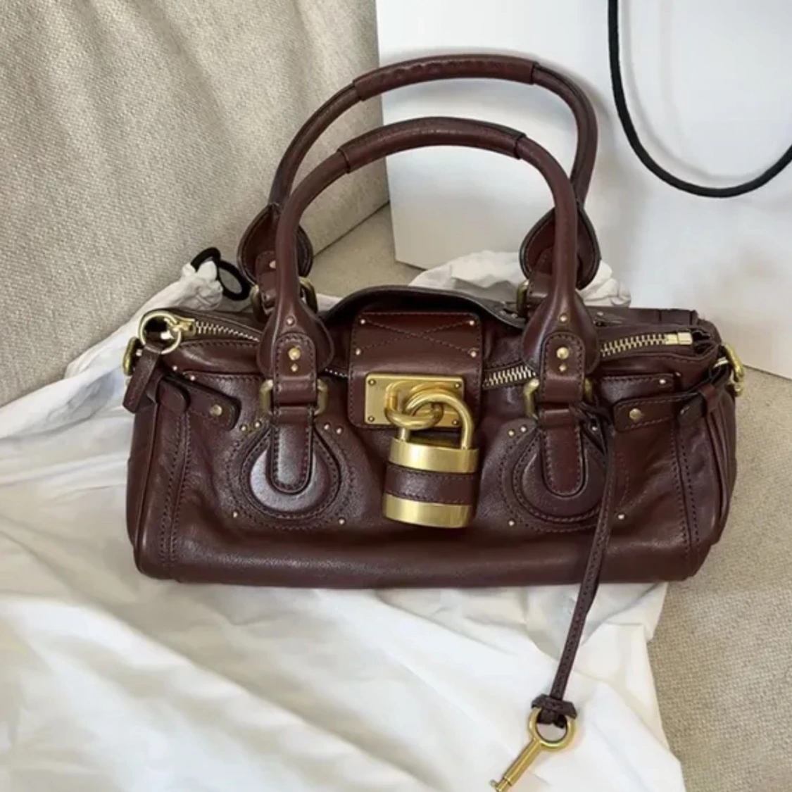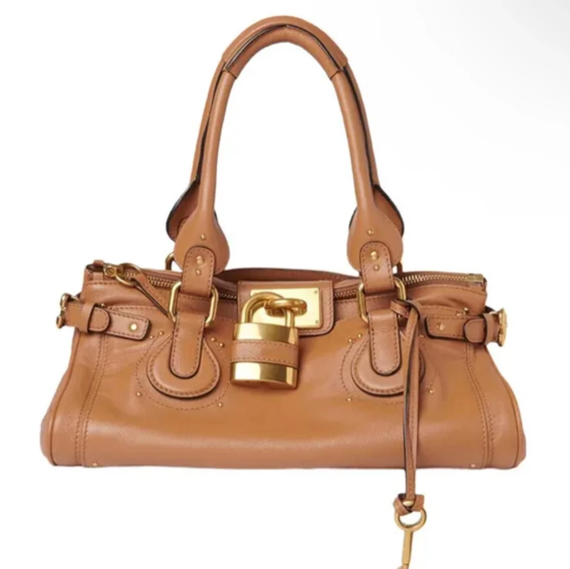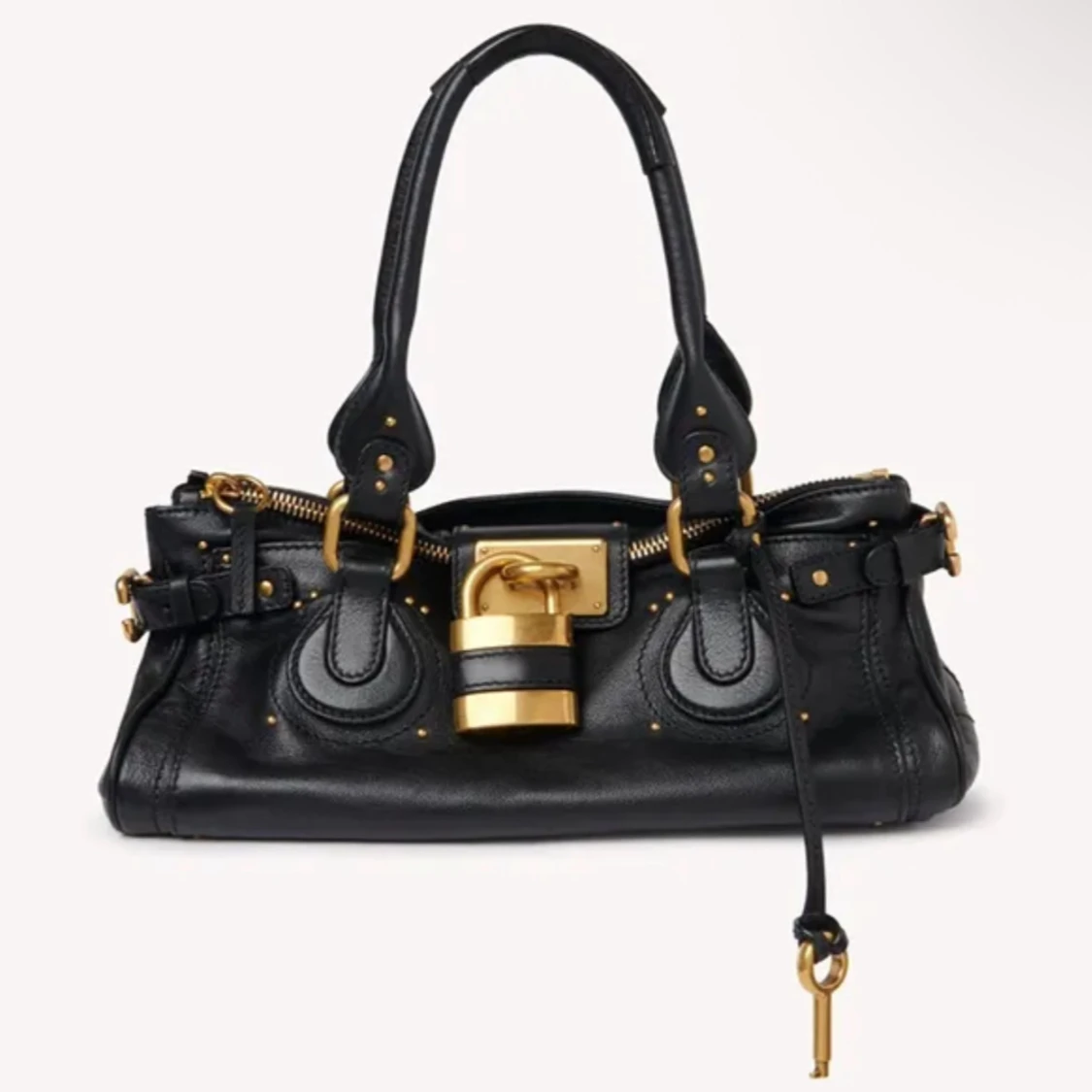 Ikonisk Chloé Paddington handväska i skinn med stora guldfärgade metalldetaljer och hänglås. Finns i svart, mörkbrun och beige. Väskan har dubbla handtag, dragkedja och dekorativa spännen. Perfekt för dig som vill ha en statementväska med lyxig känsla.