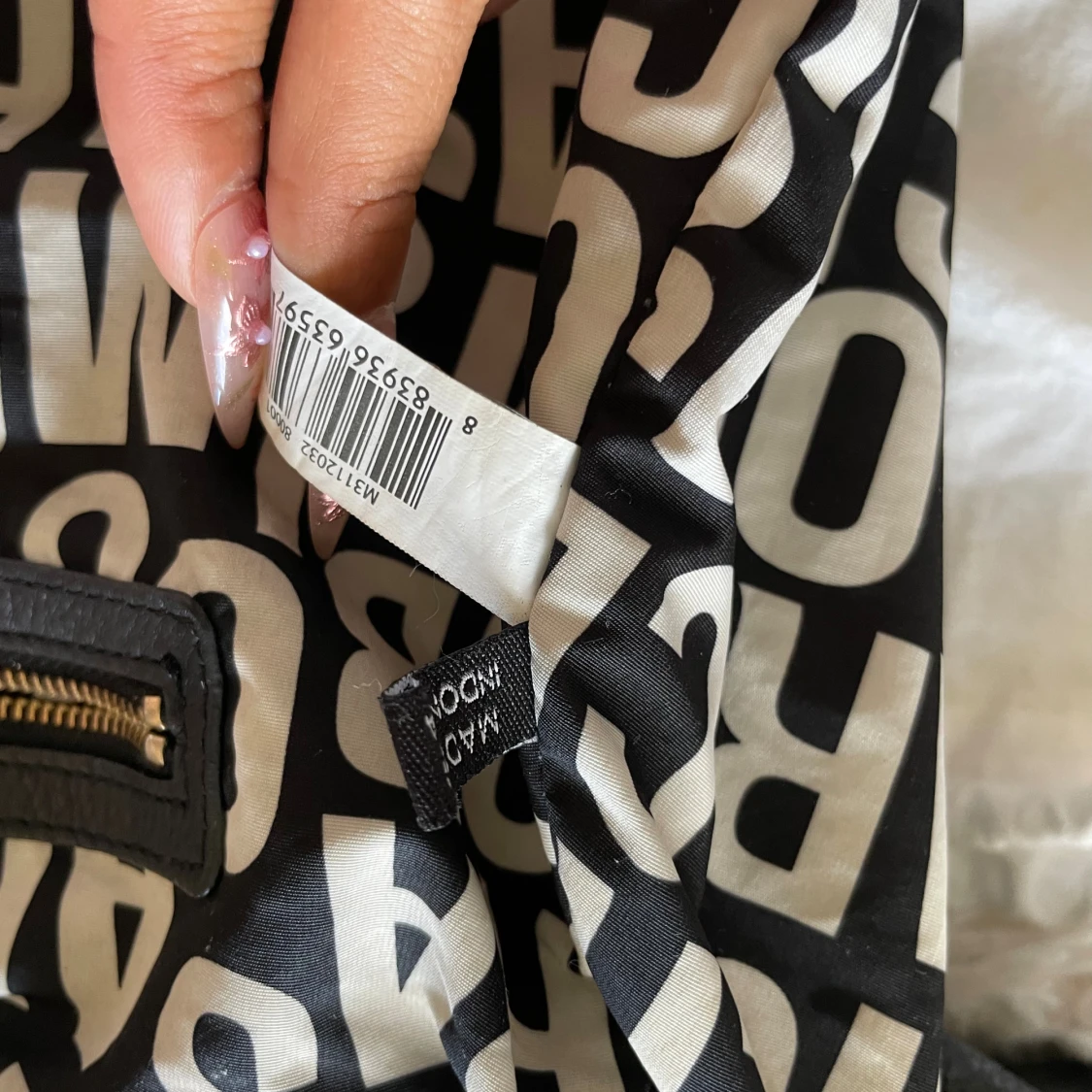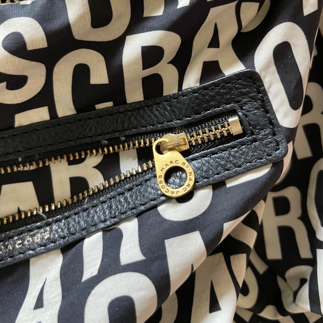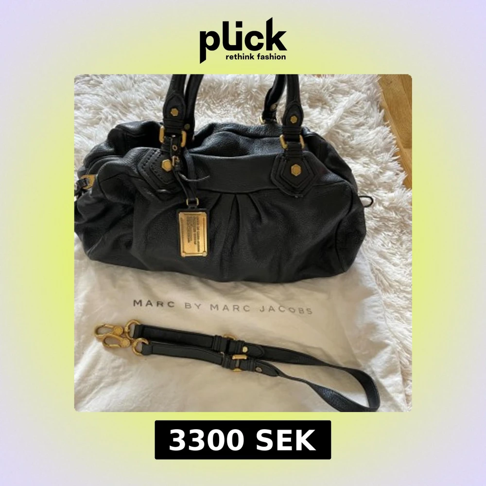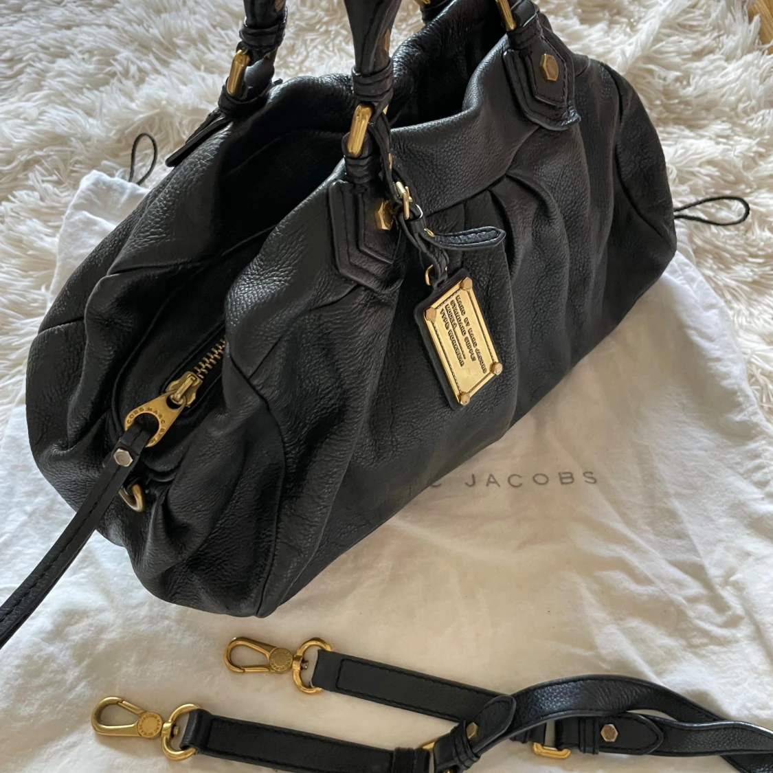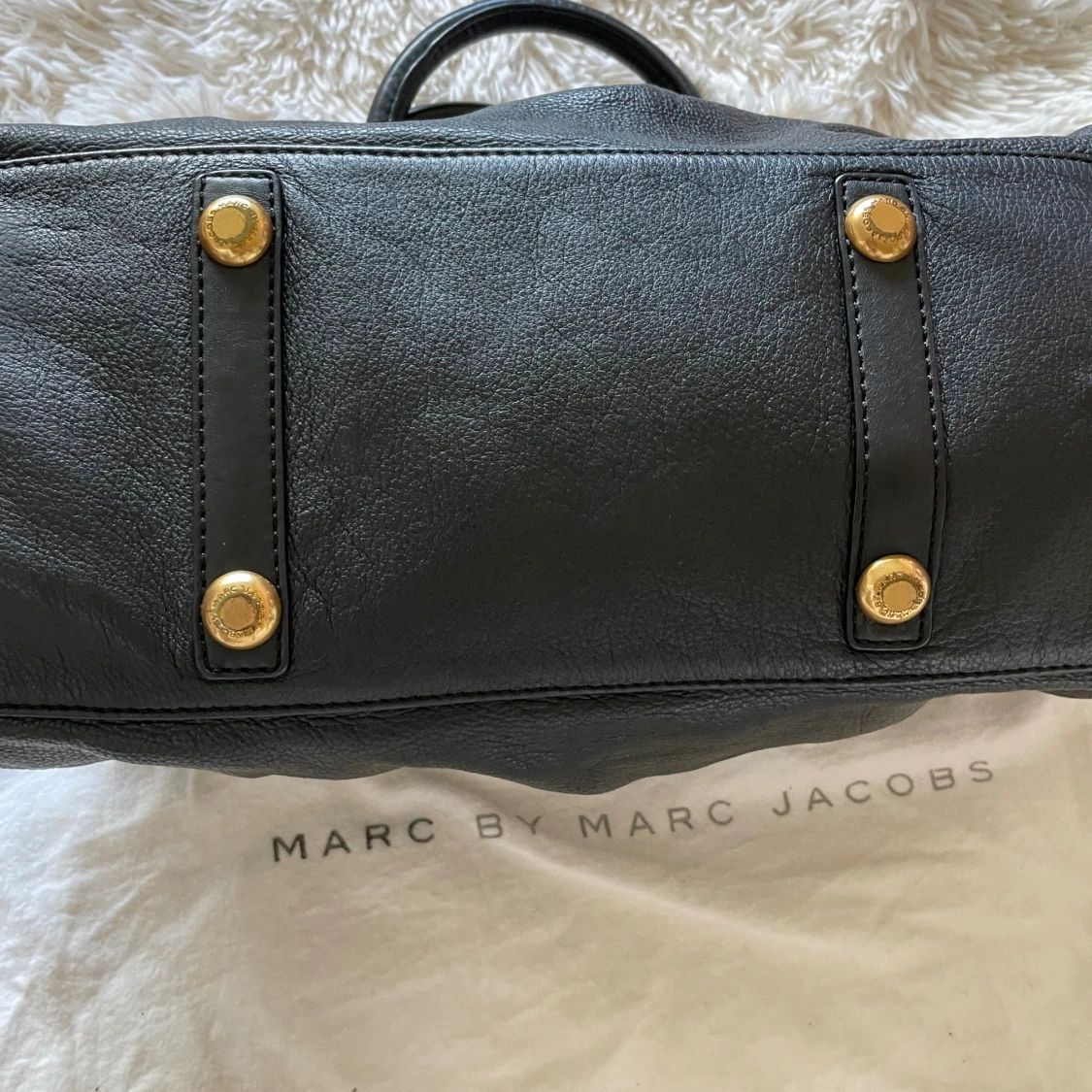 Snygg svart handväska från Marc by Marc Jacobs i äkta skinn med guldfärgade metalldetaljer och avtagbar axelrem. Väskan har plisserade detaljer, dekorativ metallbricka framtill och innerfoder med logomönster. Perfekt för dig som vill ha en klassisk och stilren väska.