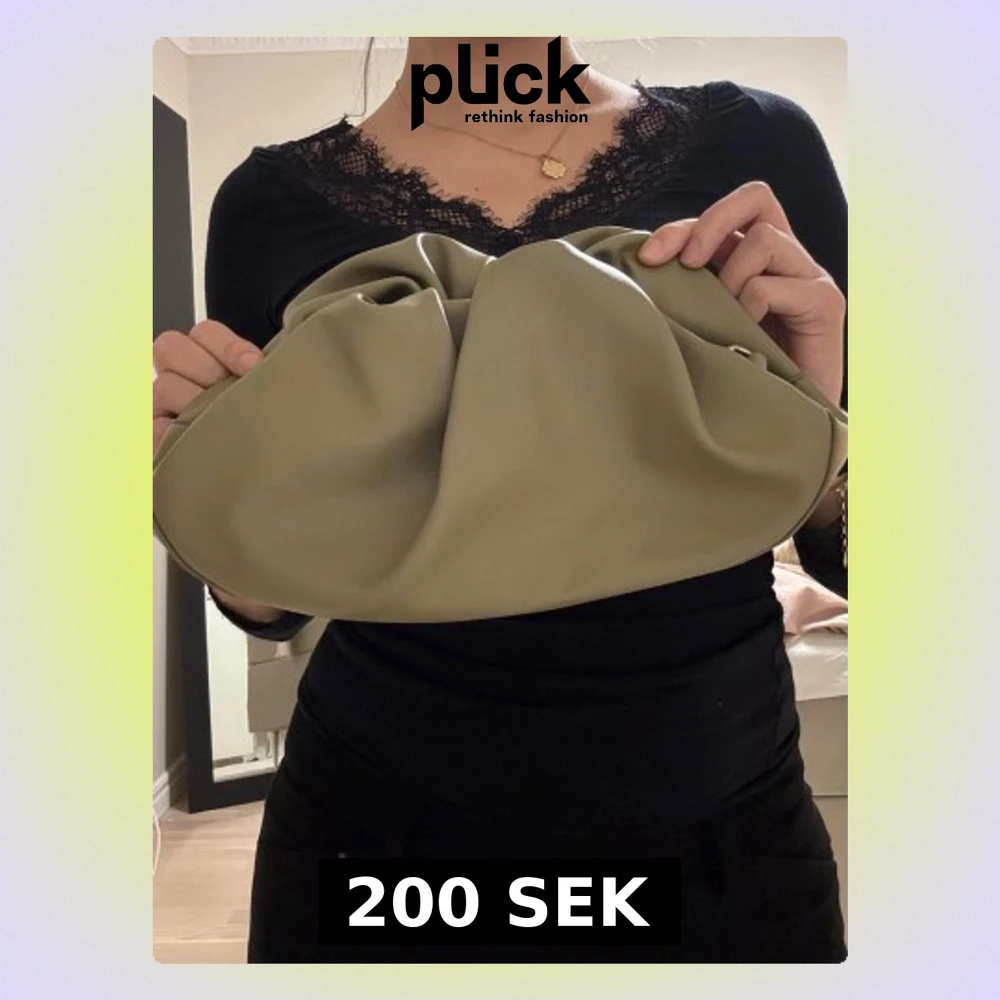 En olivgrön clutch bag som jag köpte på Plick med snöre, men snöret gick sönder så tog bort det. Fint läder material🥰