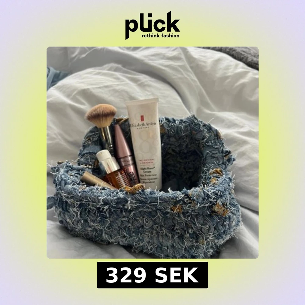 Unik handväska virkad av återvunna denimtyger i olika blå nyanser. Väskan har en cool, ruffig look med fransiga detaljer och inslag av bruna toner. Perfekt för dig som gillar statement-accessoarer och vill sticka ut med en kreativ och hållbar stil.