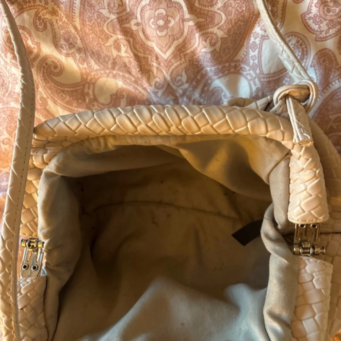 Snygg beige axelväska med lång rem och flätad design. Väskan har en mjuk, slouchy form och är tillverkad i skinn med ett invändigt foder. Perfekt för dig som gillar stilrena och trendiga accessoarer. Lite smutsig inuti