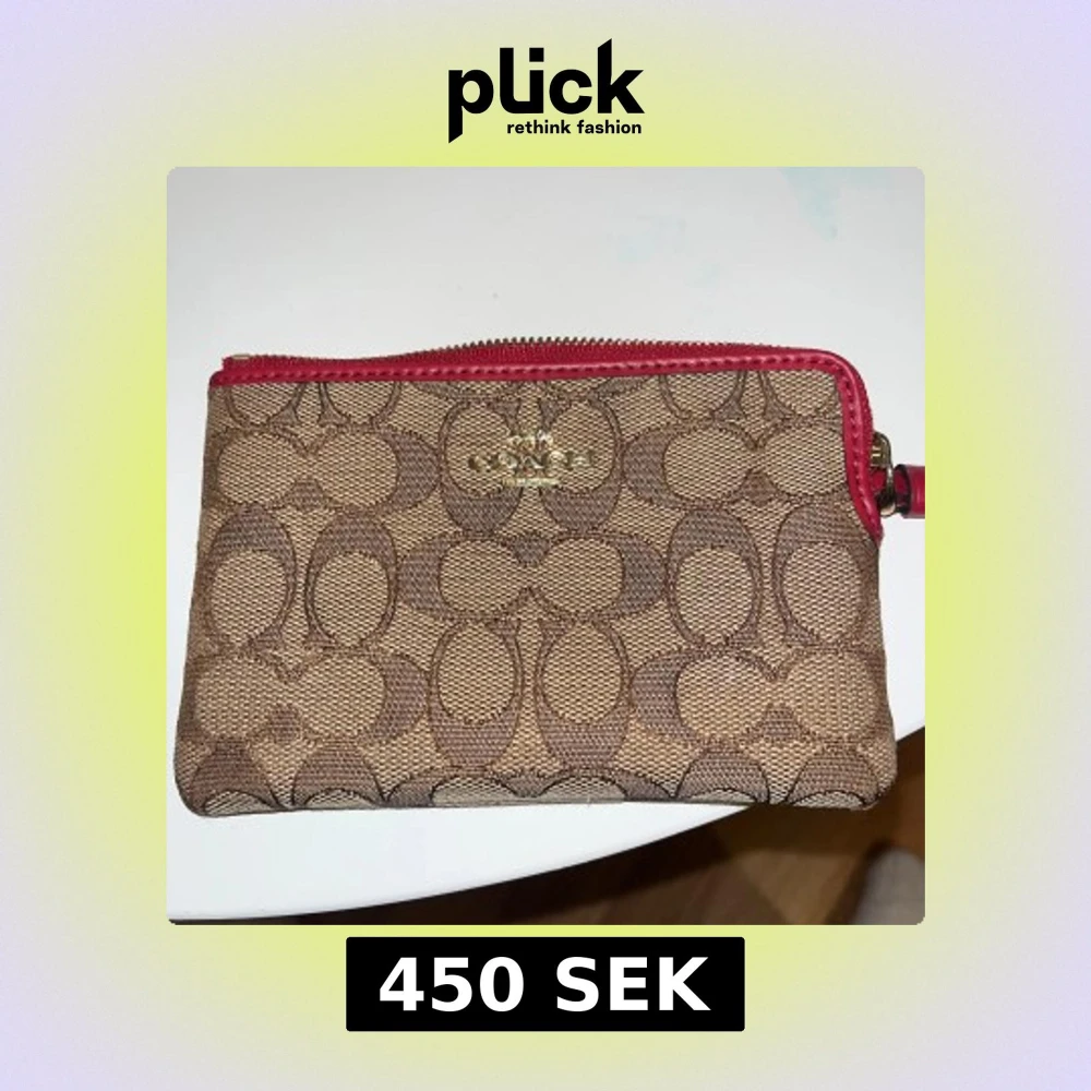 Snygg plånbok från Coach med klassiskt monogrammönster i beige och brunt. Plånboken har detaljer i rött och guldigt logotypmärke framtill. Invändigt finns fack för kort och småsaker, och dragkedjan är i guld. Perfekt för att hålla ordning på det viktigaste.