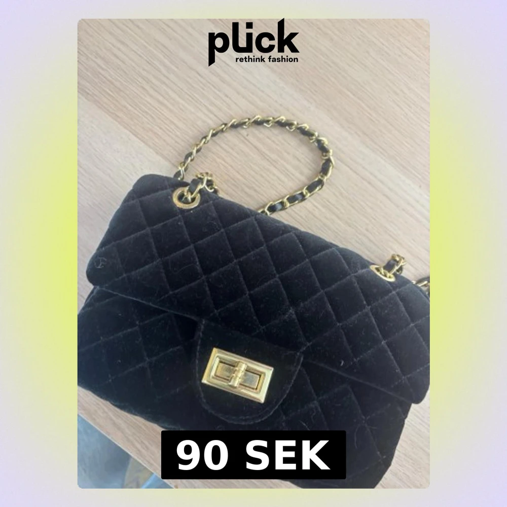 Säljer en svart quiltad axelväska i mjuk sammet med guldfärgade detaljer och kedjerem. Väskan har ett klassiskt vridlås framtill och ett innerfack med dragkedja. Perfekt storlek för det viktigaste och ger en lyxig känsla till din outfit.