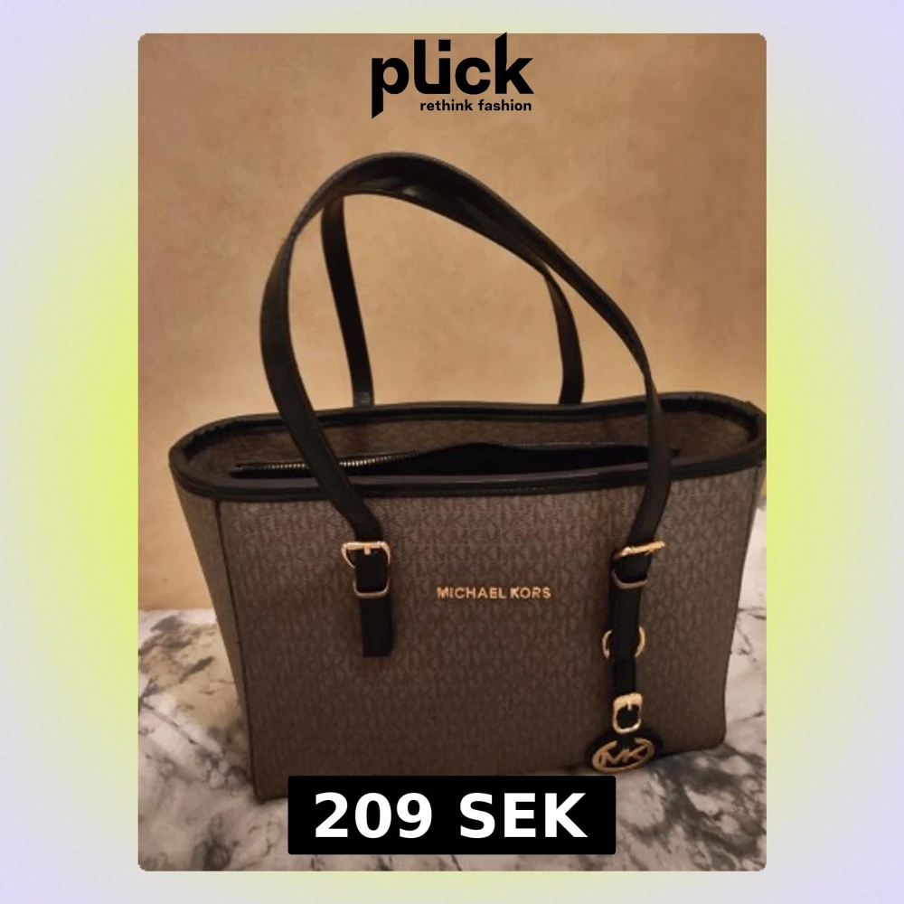 Snygg handväska från Michael Kors i brun färg med MK-mönster och svarta detaljer. Väskan har guldfärgade metalldetaljer, dragkedja upptill och flera fack inuti. Medföljer en justerbar axelrem i svart skinn. Perfekt storlek för allt du behöver ha med dig.