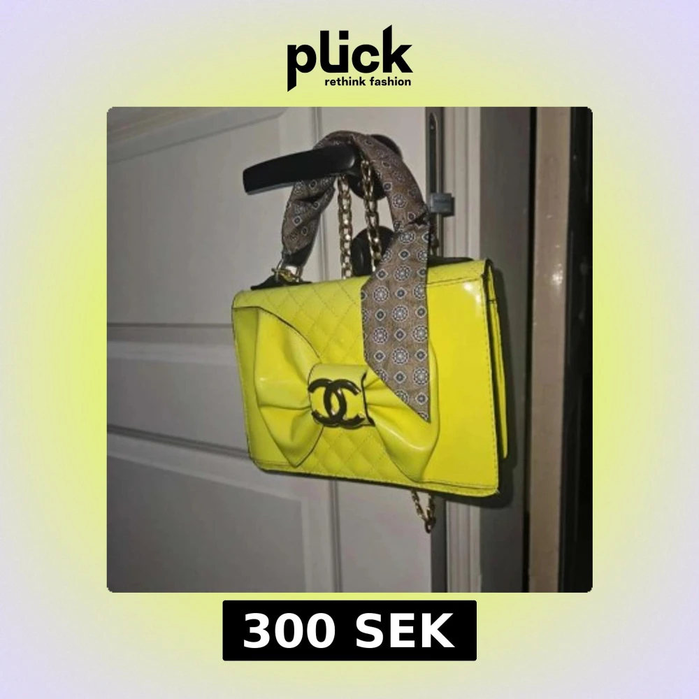 Snygg gul handväska med quiltad design och stor rosett framtill. Väskan har guldfärgad kedja, handtag med mönstrad scarf och klassisk CC-logga i metall. Perfekt för dig som vill sticka ut med en färgglad accessoar.