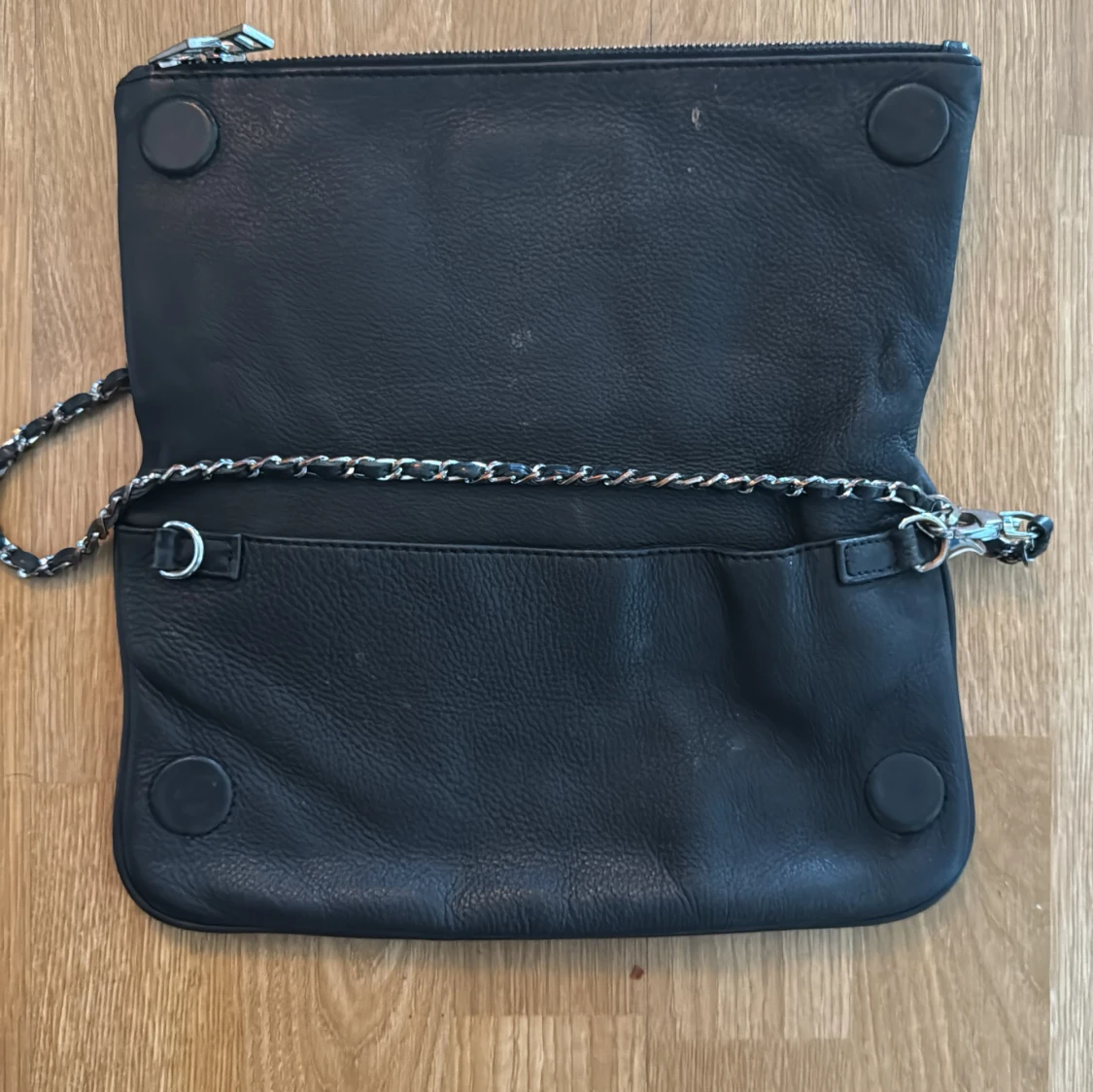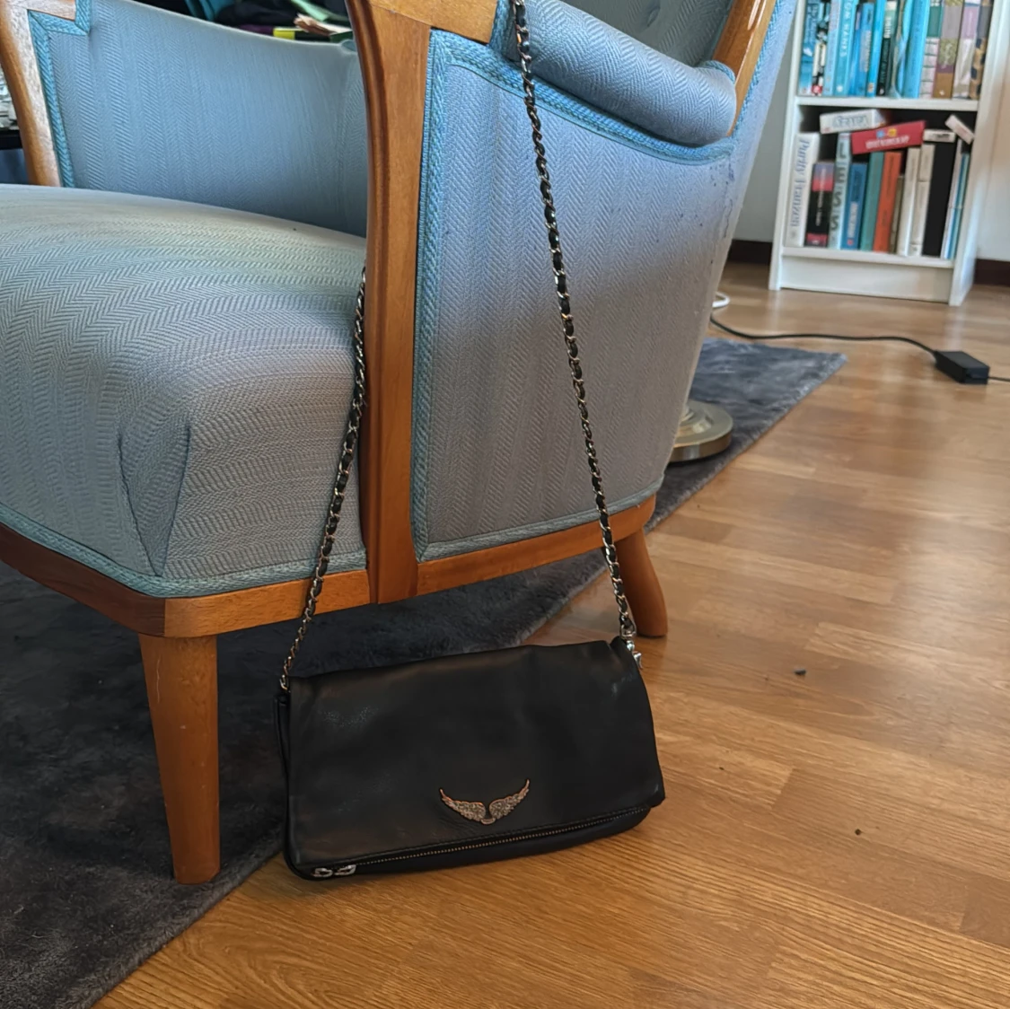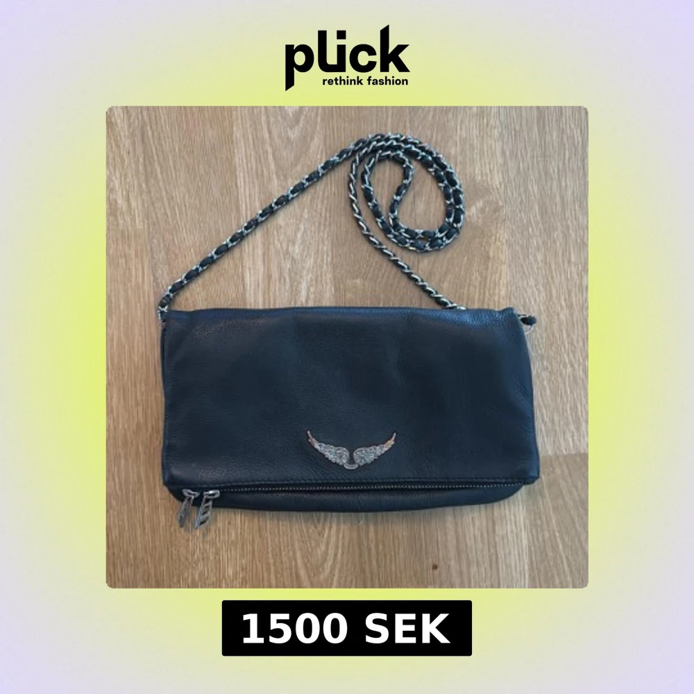 Säljer en svart axelväska från märket Zadig Voltaire i skinn med silverfärgad kedjerem och snygg vingdetalj framtill. Väskan har dragkedja nertill och är perfekt för att bära det viktigaste. Stilren och passar till många outfits. Väskan saknar ett fäste för bandet på ena sidan men går ändå bra att använda. Kan säkerligen repareras. Även emblemet på utsidan är slitet, se bilder.