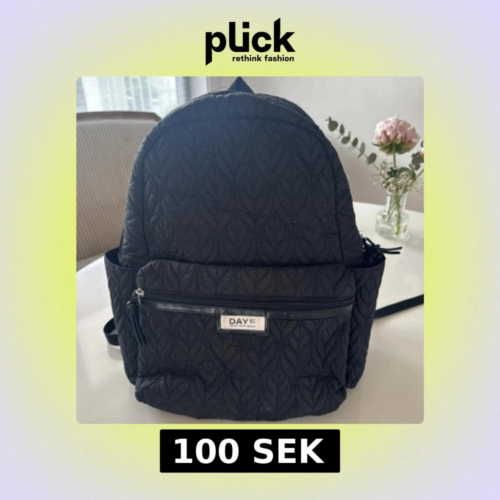 Säljer en svart quiltad ryggsäck från DAY med flera fack och dragkedja framtill. Väskan har vadderade axelremmar och sidofickor, perfekt för att bära med sig allt man behöver. Klassisk och stilren design med mönstrad yta.