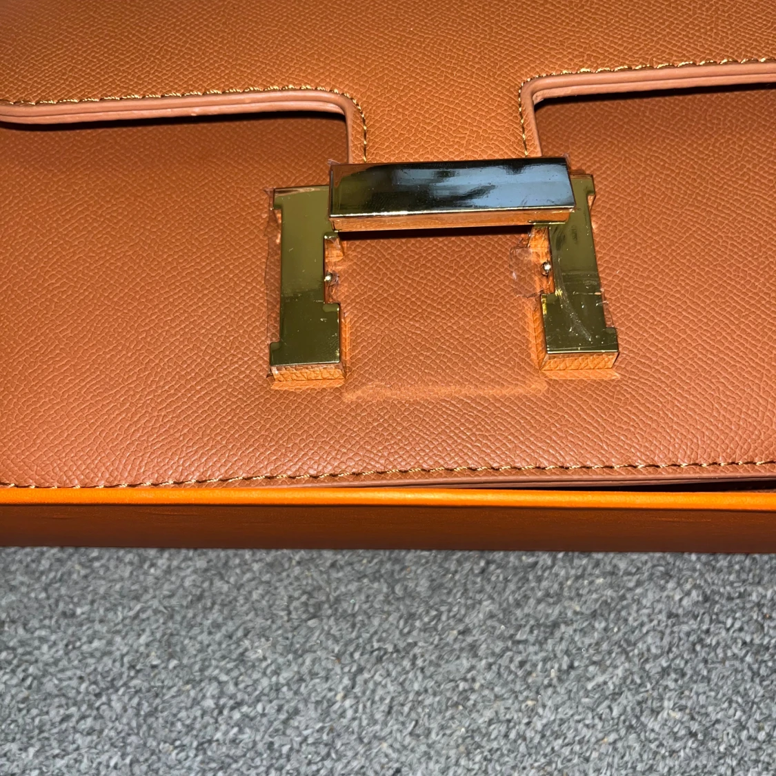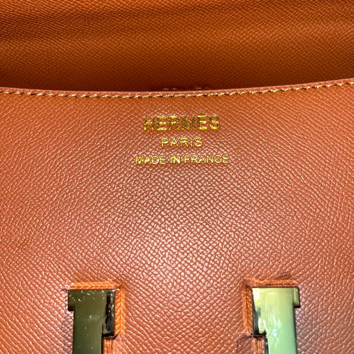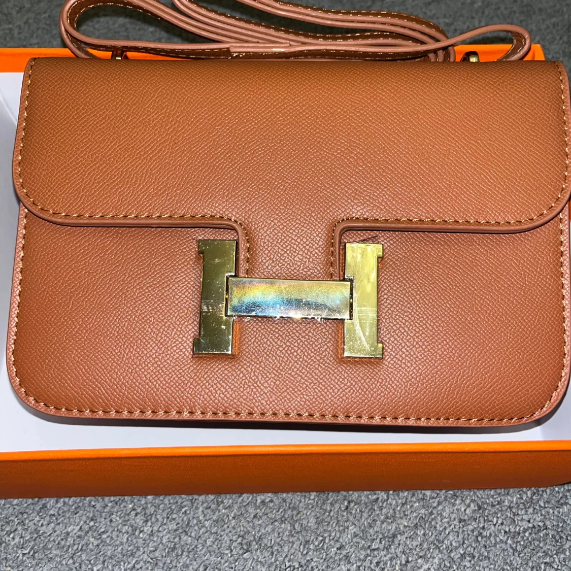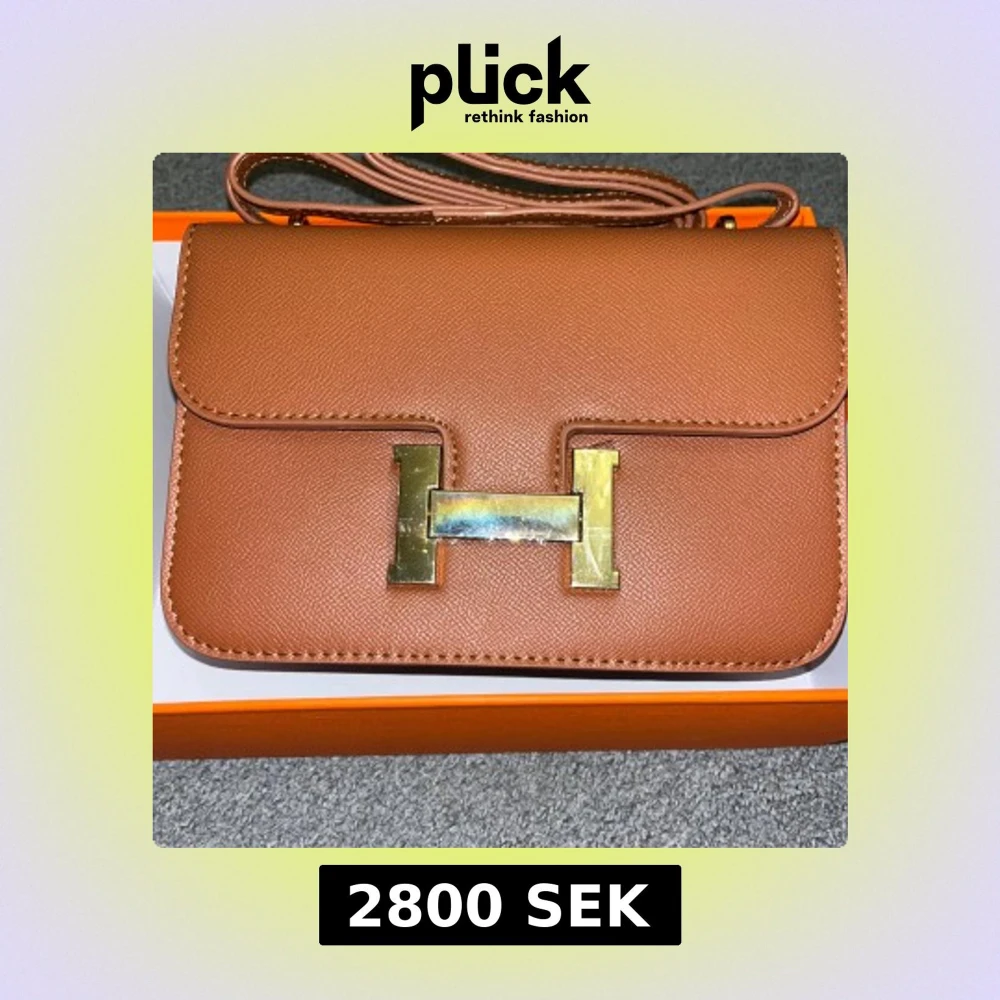 SÀljer en brun axelvÀska med klassiskt H-spÀnne i guldmetall. VÀskan Àr tillverkad i exklusivt skinn och har en stilren, rektangulÀr form med justerbar axelrem. Insidan har flera fack för smart organisering. Perfekt för dig som vill ha en ikonisk och lyxig accessoar.
