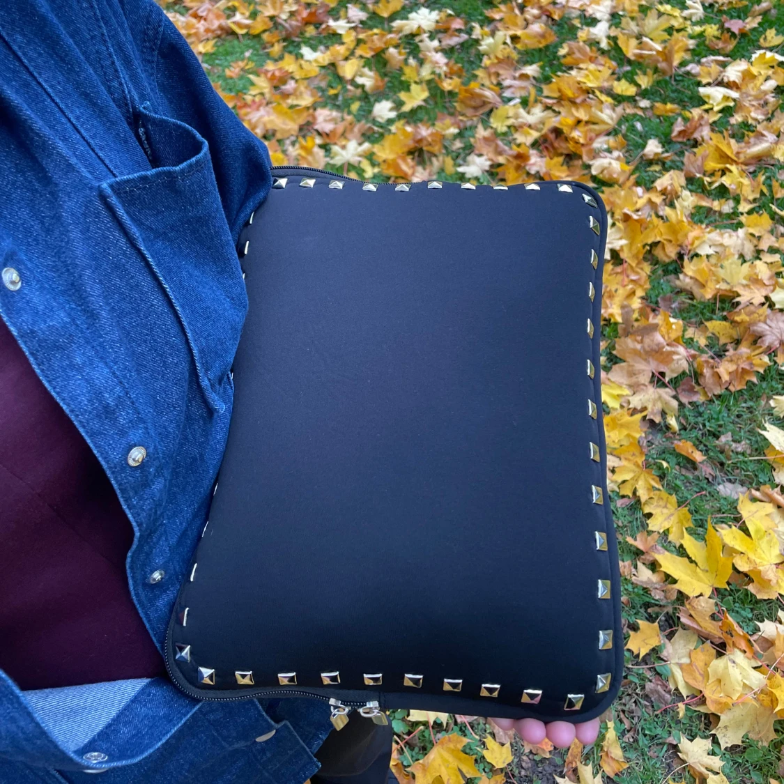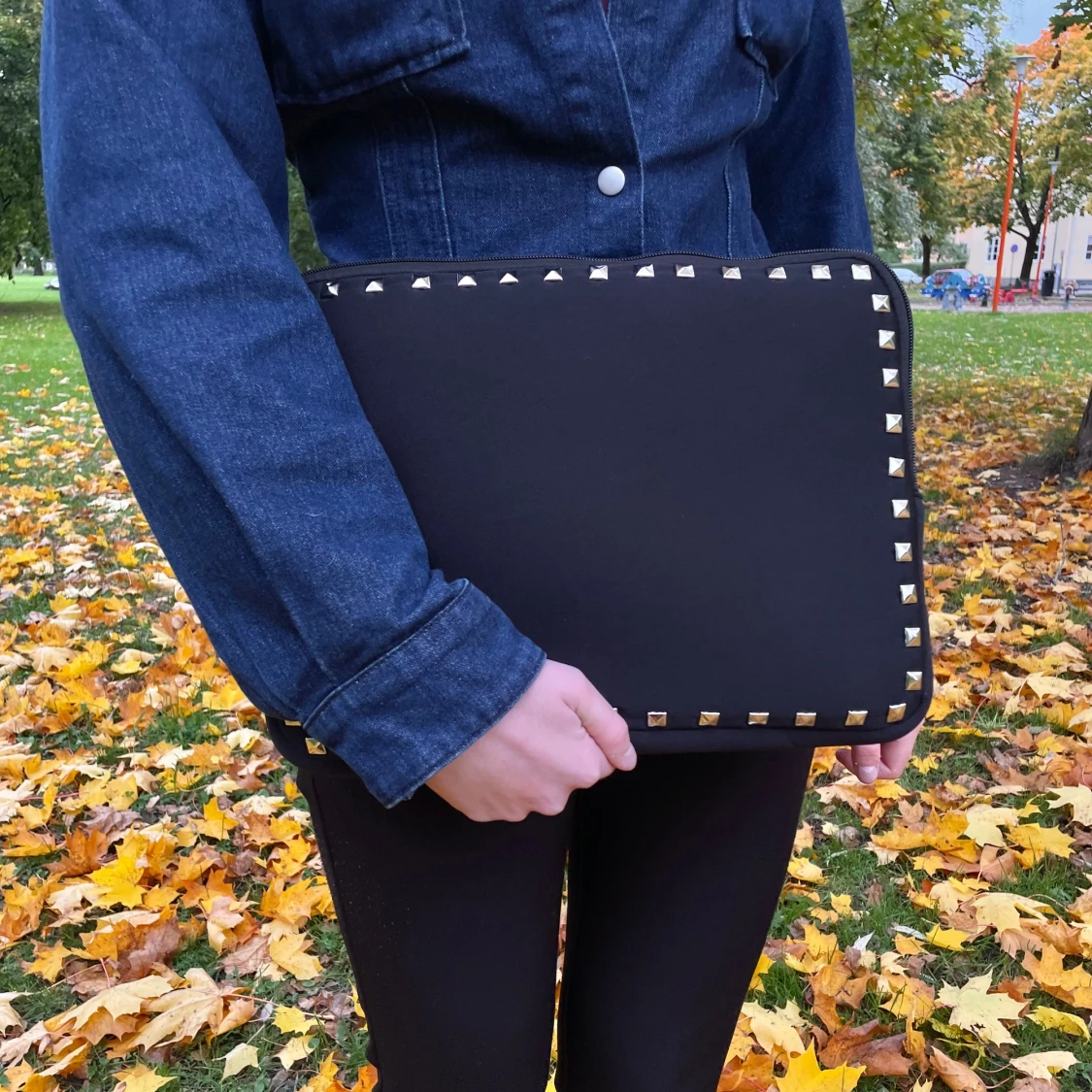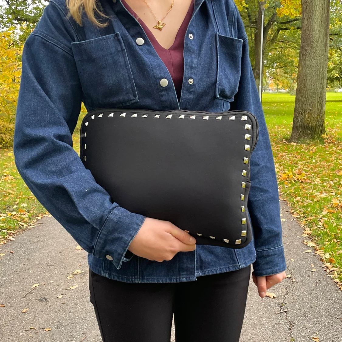 Datorfodral med nitar, vattentätt material och plats för allt du behöver. Storlek 34,5x25cm 🥂🍁 Superfint och praktiskt fodral som passar perfekt till både skola och jobb. Rymmer dator, laddare och annat utan problem. Materialet är tåligt och nitarna ger den där lilla extra detaljen som gör att den sticker ut! Fodralet är handgjort och egen designat, inspirerat av Valentino. Snabb leverans! ⚜️