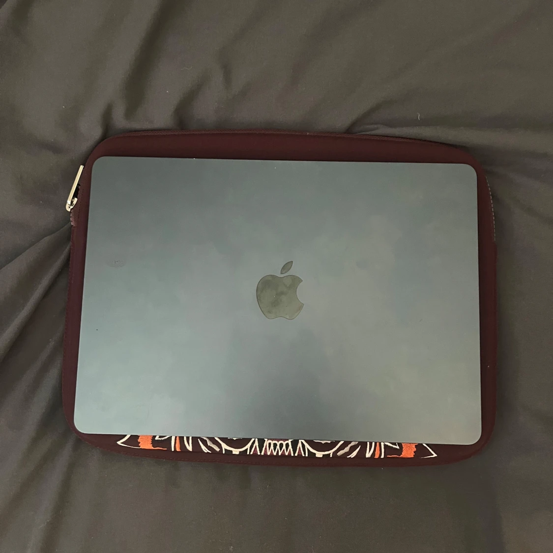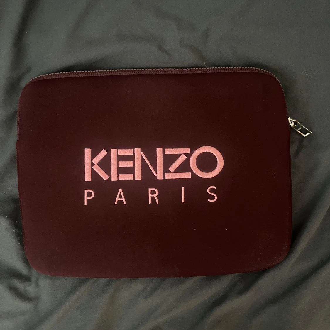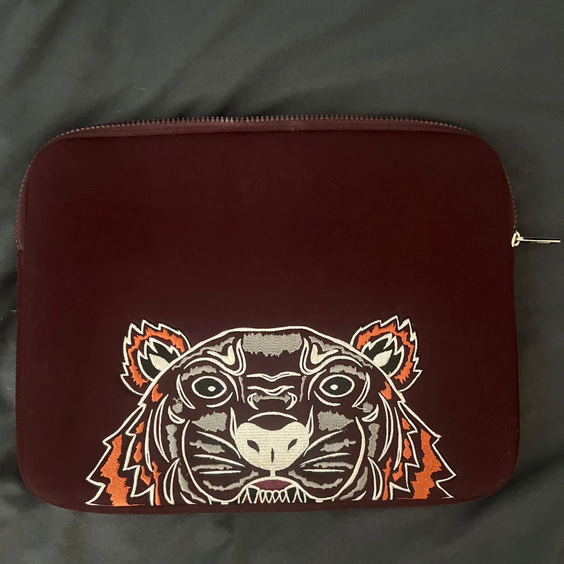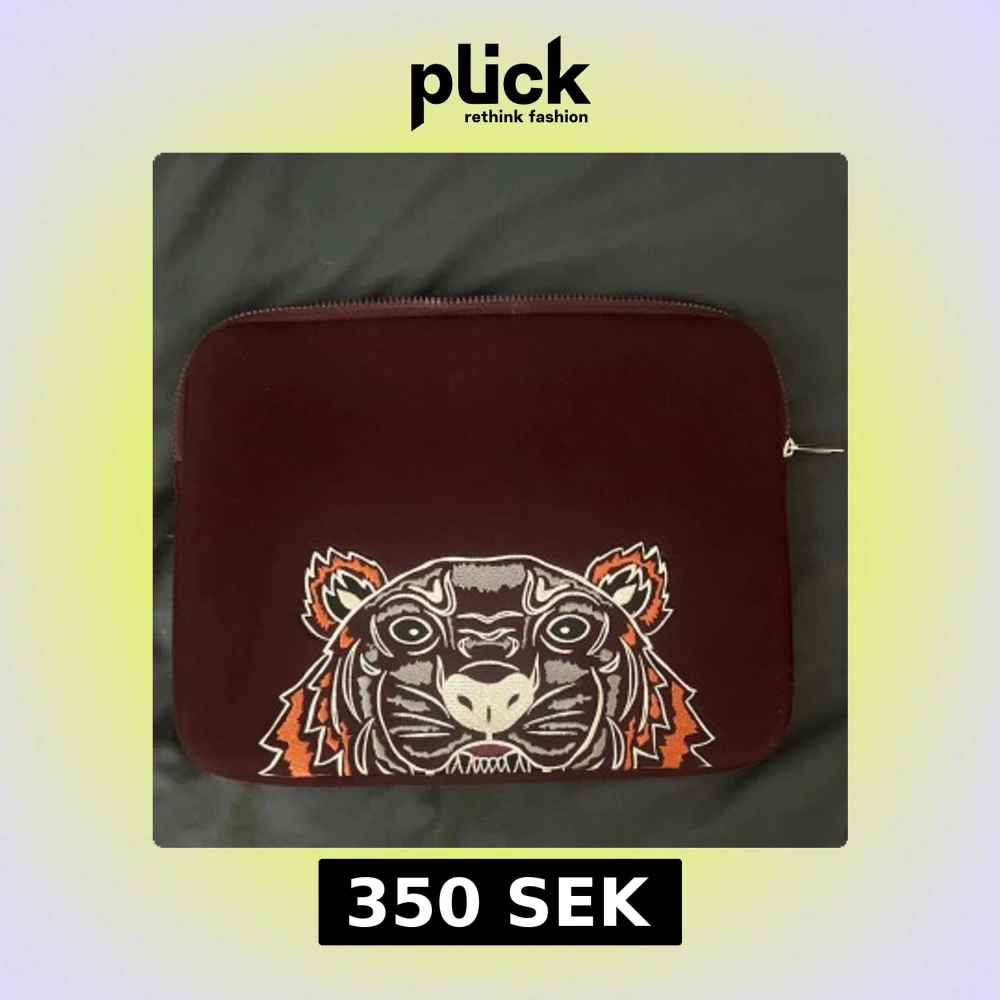 Säljer en vinröd datorfodral från Kenzo med tigerbroderi på ena sidan och Kenzo Paris-logga på andra. Datorn är en MacBook Air och passar perfekt för fodralet. Inga tecken på användning. Nypris:1000kr