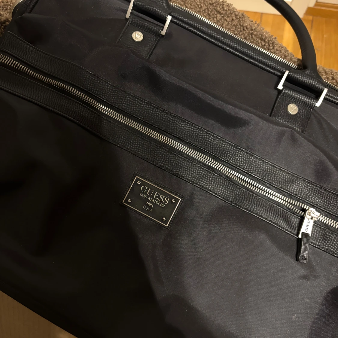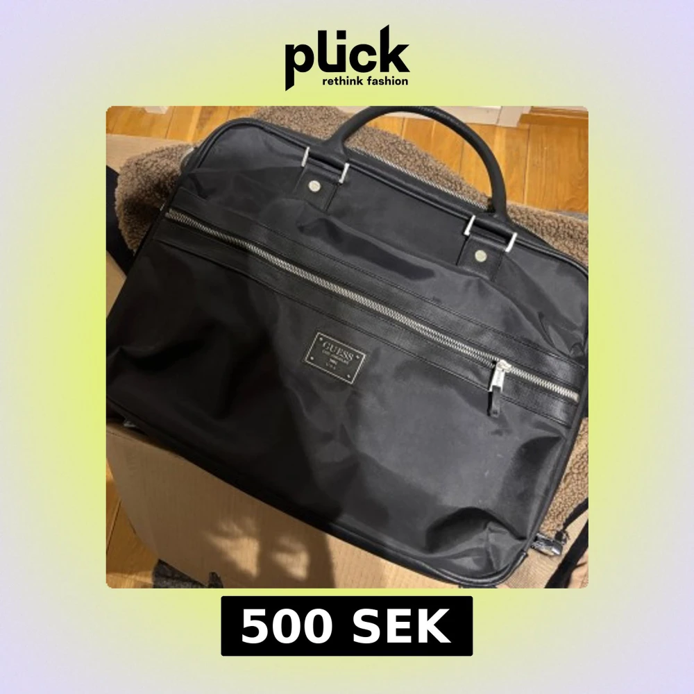 Äkta! Stilren svart datorväska från Guess med metallfärgad logoplatta och detaljer. Väskan har både handtag och justerbar axelrem, samt flera fack med dragkedja. Materialet är slitstarkt och insidan har praktiska fack för laptop och tillbehör. Mycket fint skick! Perfekt för skolan!