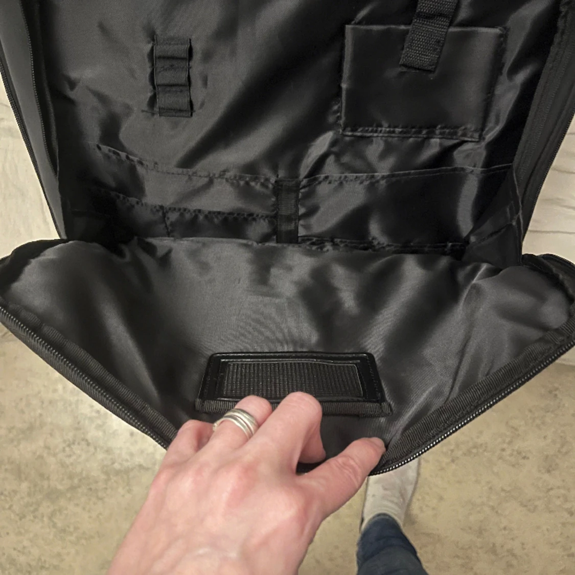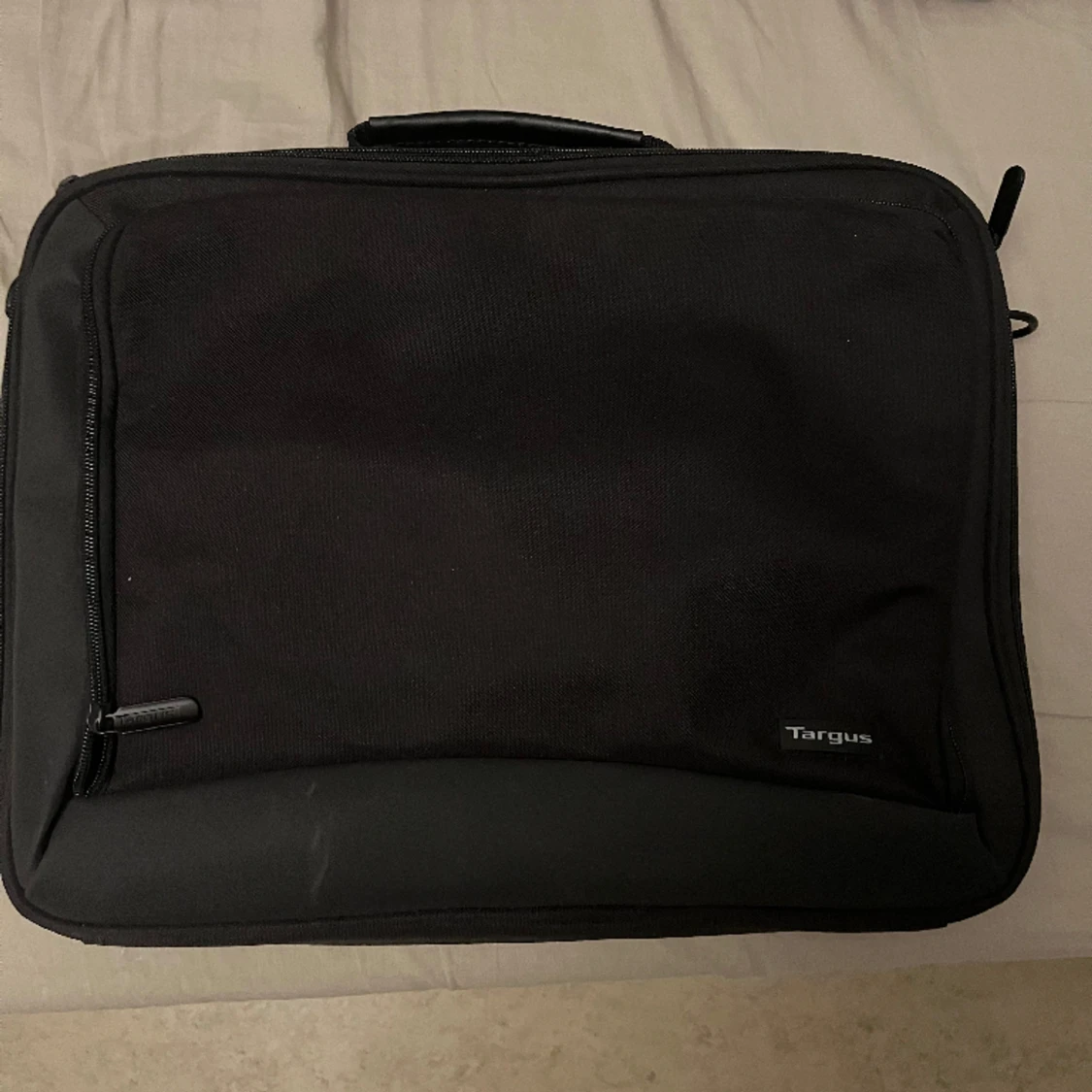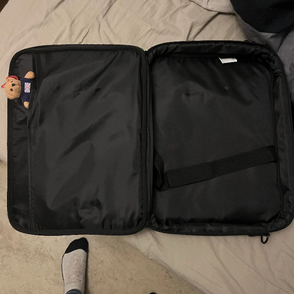 Ett ytterfack och två stora innerfack plus småfack för pennor och dylikt. Felköp, aldrig använd. Avtagbar axelrem