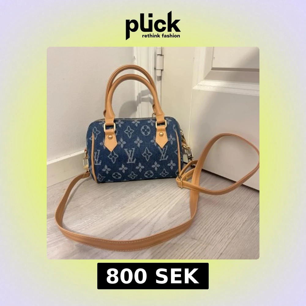 Snygg handväska i blå denim med klassiskt monogrammönster. Väskan har ljusbruna skinnhandtag och avtagbar axelrem i samma färg. Guldiga metalldetaljer och dragkedja upptill. Perfekt storlek för det viktigaste och en riktigt trendig accessoar.