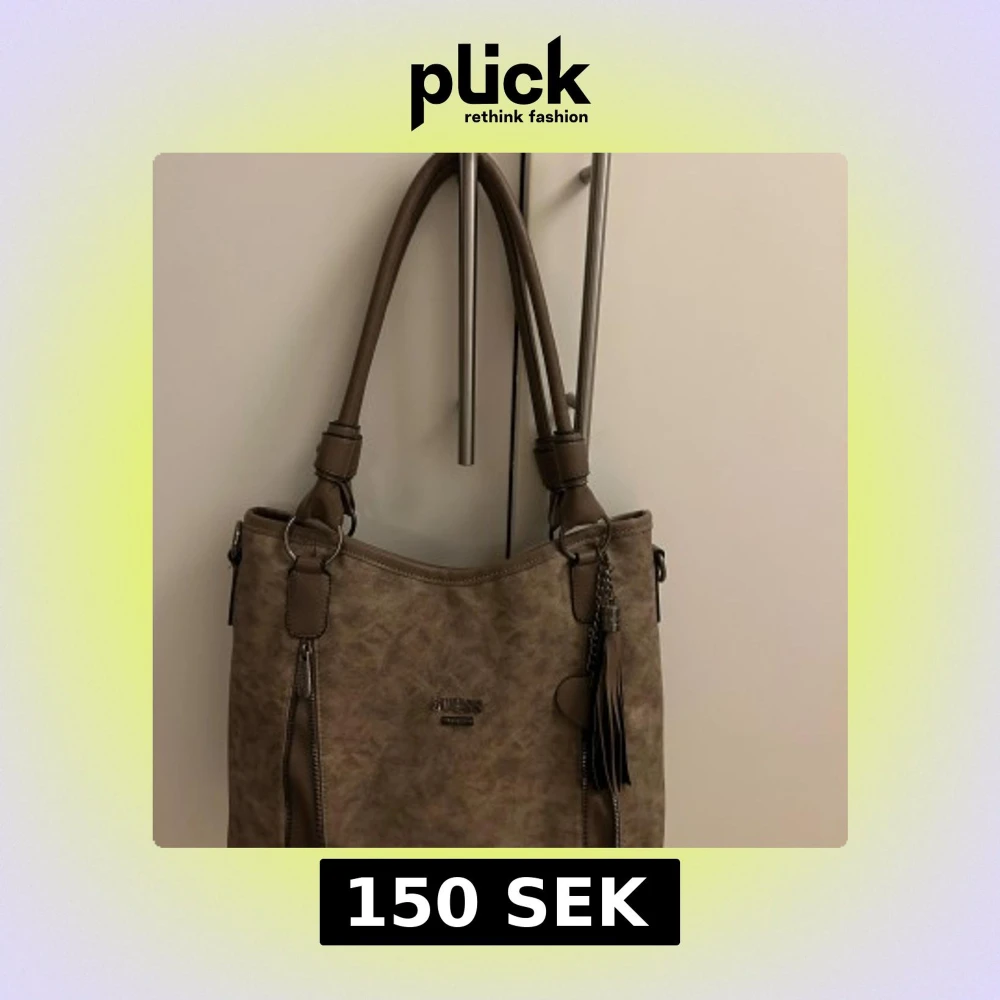 Snygg beige axelväska från Guess med stilren design. Väskan har flera praktiska fack med dragkedja och en avtagbar axelrem. Den har också en dekorativ tofsdetalj på framsidan. Aldrig använd.