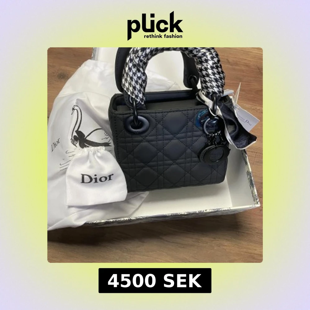 Supersnygg svart Lady Dior handväska i quiltat skinn med klassiskt rutmönster. Väskan har handtag med svartvitt hundtandsmönstrat scarf-detalj och svarta Dior-berlocker. Kommer med axelrem och dustbag. Perfekt för dig som vill ha en ikonisk och lyxig accessoar.// obs min syster hon fick den present ingen kvitto