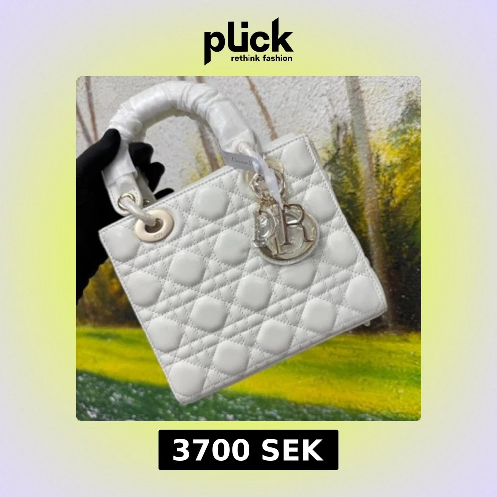 Superfin Lady Dior handväska i vit quiltad skinn med ikoniska Dior-hängen i silver. Klassisk boxig form med två handtag och snygga detaljer i metall. Perfekt för dig som vill ha en lyxig och tidlös accessoar med exklusiv känsla.