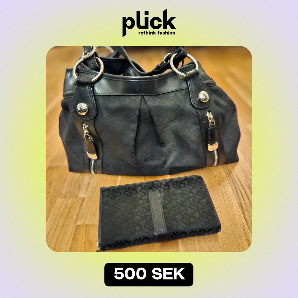 Säljer en snygg svart väska och matchande plånbok från DKNY. Väskan har silverfärgade detaljer och dragkedjor, perfekt för både vardag och fest. Plånboken har flera fack och en praktisk dragkedja. Båda är i mycket bra skick och har ett diskret mönster som ger en lyxig känsla. Utan skavanker på utsidan, fläckar på insidan. Du får plats med datorn i den.