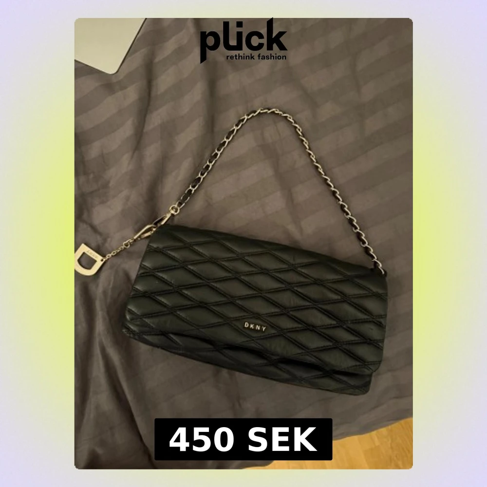 Snygg svart axelväska från DKNY med quiltat mönster och siljver kedja som axelrem. Väskan har en rektangulär form och DKNY-logga i metall framtill. Materialet är mjukt skinn och detaljerna ger en lyxig vibe. Perfekt storlek för det viktigaste och stilren look.