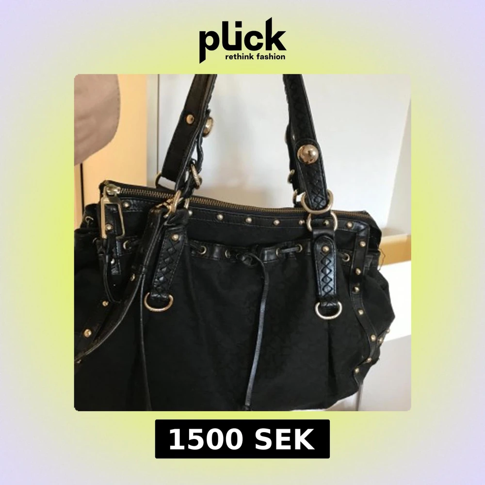 Snygg svart axelväska från DKNY med guldfärgade nitar och detaljer. Väskan har flätade handtag, dragkedja upptill och dekorativa ringar. Materialet är skinn och insidan är fodrad med ljust tyg med DKNY-logga. Perfekt för dig som gillar statement-accessoarer.