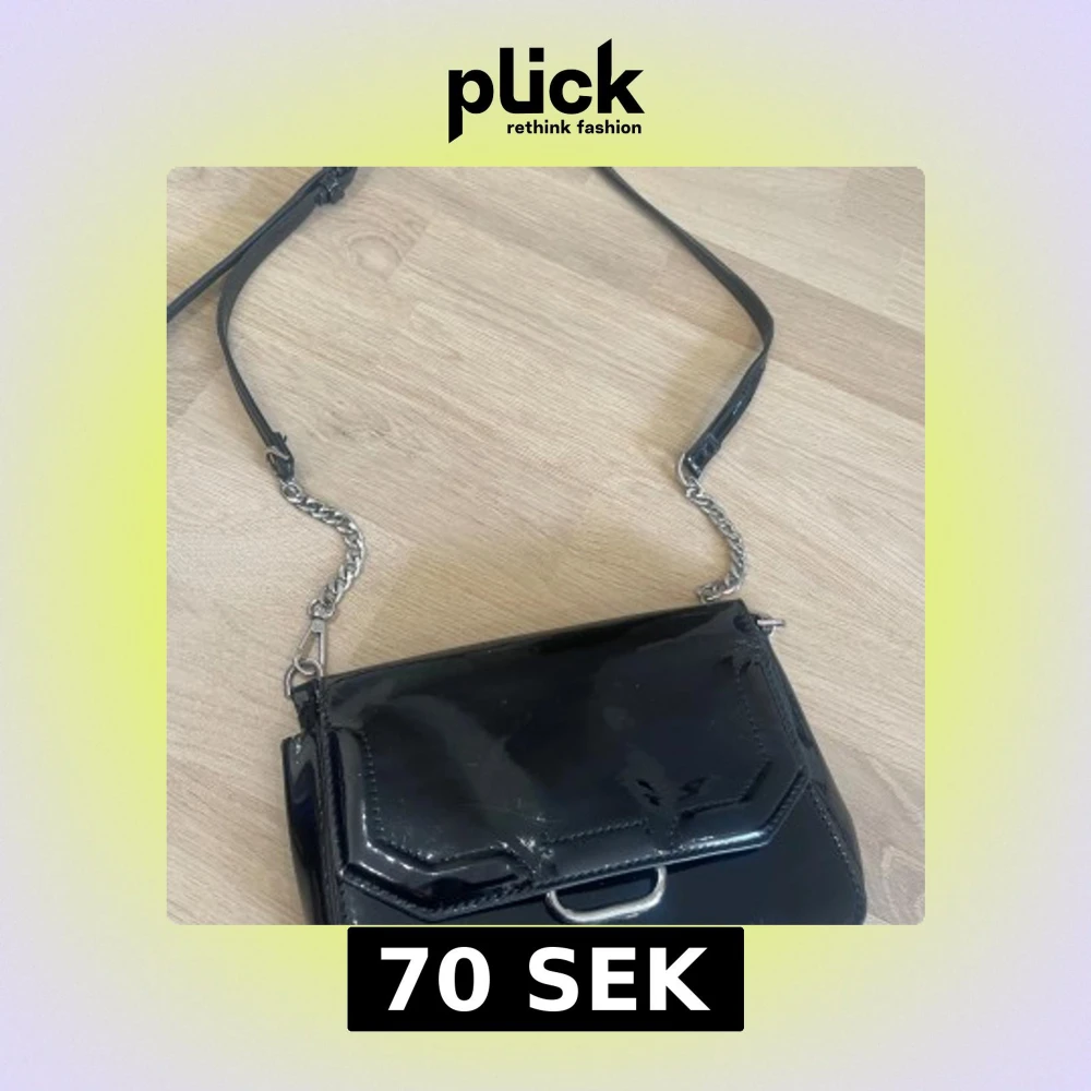 Säljer en svart axelväska i glansigt lackmaterial med silverfärgad kedja och detaljer. Väskan har ett stilrent och modernt utseende med innerfack och dragkedja. Perfekt för att lyfta din outfit.