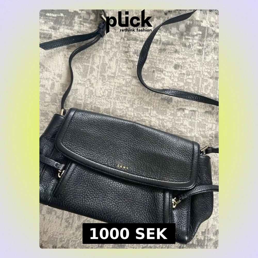 Säljer en svart axelväska från DKNY i skinn med guldfärgade detaljer. Väskan har justerbar axelrem, magnetlås och DKNY-logga är lite rostade. Perfekt storlek för det viktigaste och stilren design som funkar till allt.