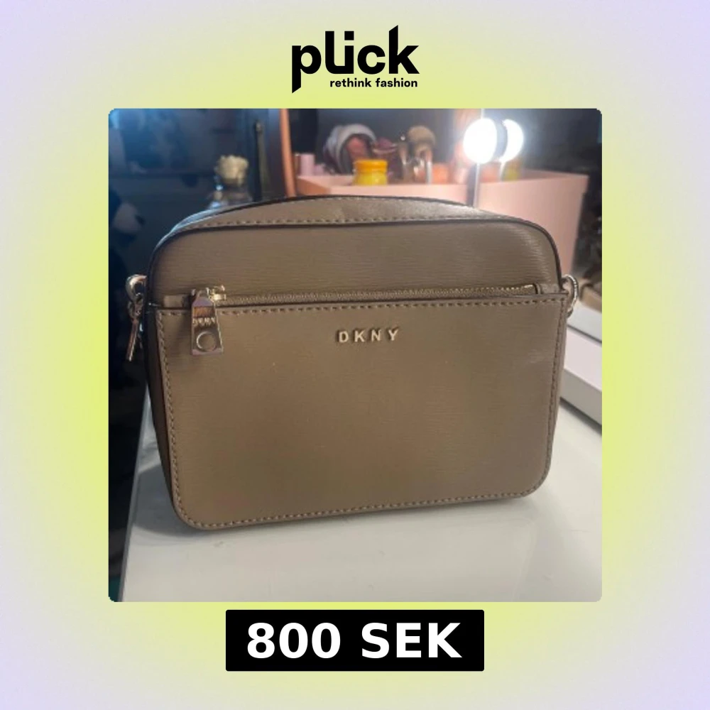 Snygg beige/khaki axelväska från DKNY i slätt skinn med guldfärgade detaljer och kedja på axelremmen. Väskan har dragkedja upptill och ett praktiskt ytterfack med DKNY-logga framtill. Perfekt storlek för det viktigaste och stilren design.
