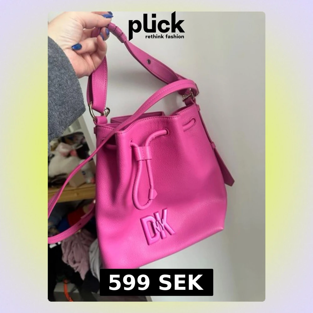Säljer en snygg rosa handväska från DKNY i bucket-modell. Väskan har justerbar axelrem, dragsko upptill och präglad DKNY-logga framtill. Insidan är fodrad med beige tyg och har en innerficka med dragkedja. Perfekt för dig som vill ha en färgklick till din outfit!